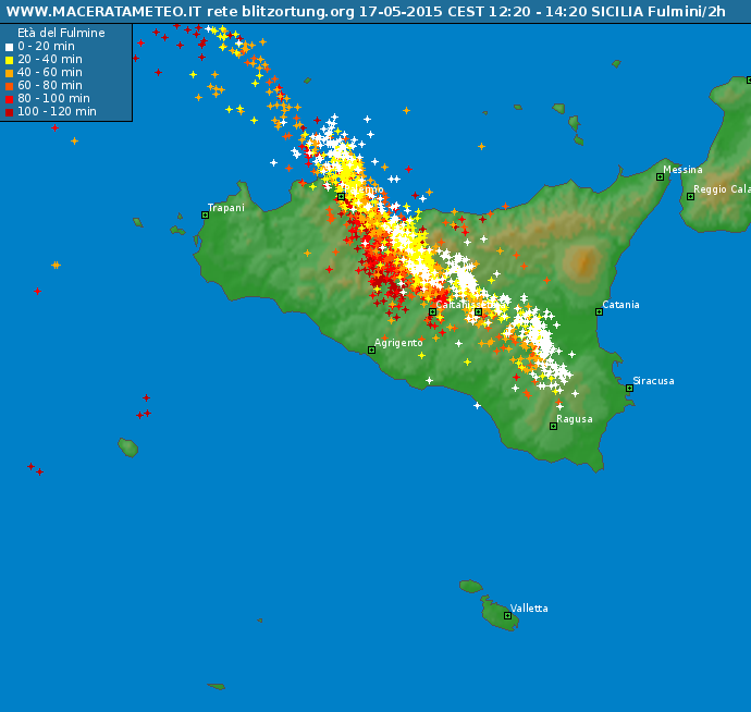 I sistema temporalesco a mesoscala in azione sulla Sicilia centrale tende, molto gradualmente, a spostarsi verso levante, iniziando a coinvolgere direttamente anche l’ennese, le aree più interne del catanese e del messinese, dove sono in atto forti temporali e autentici nubifragi. Poco fa nel paese di Catenanuova, si è verificato un violento nubifragio che è stato capace di scaricare in nemmeno meno di un’ora ben 65 mm di pioggia. Segno della violenza delle precipitazioni associate a questi temporali veramente esplosivi. Ma temporali intensi sono da poco in atto anche sull’entroterra catanese, dove inizia a piovere a dirotto, con lampi e tuoni fragorosi, e sull’area fra Madonie e Nebrodi, ove si segnalano diffusi allagamenti e grandinate. Nel corso della serata i fenomeni si estenderanno al settore più occidentale del messinese tirrenico, entroterra catanese, nisseno e siracusano, dove attendiamo forti rovesci e locali nubifragi, accompagnati da chicchi di grandine, forti colpi di vento ed intensa attività elettrica.