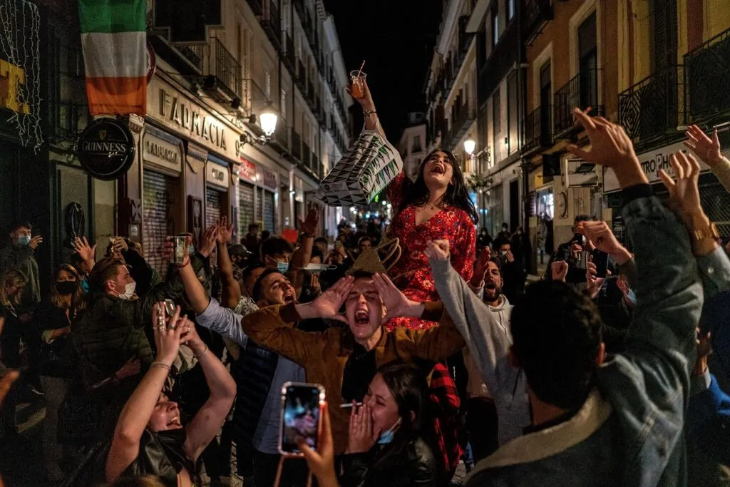 Nello stesso giorno in cui per milioni di spagnoli iniziava una Settimana Santa in cui non potranno esserci spostamenti tra comunità per le restrizioni in vigore per contenere la pandemia da SARS-CoV-2, decine di giovani festeggiavano nel centro di Madrid, tra canti, balli e assembramenti: pub affollati, file per entrare in discoteca e una marea di giovani in cerca di fare festa. Insomma, immagini che appartengono al pre-pandemia.