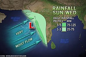 Già in questi giorni le prime forti piogge si sono abbattute sulle coste dell’India occidentale per merito del notevole effetto “stau” esercitato dai rilievi del Ghati occidentali ai venti molto umidi da SO in arrivo dal mar Arabico che riescono a bloccare le bande nuvolose apportando intense precipitazioni lungo gli stati del Kelara, Mysore e Maharashtra.