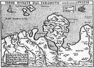 Lo tsunami del Gargano. Il 30 luglio 1627, alle 10.50, si verifica un violento terremoto con epicentro tra i paesi di S. Severo e Lesina (DBMI04, Stucchi ed altri, 2007), al margine occidentale del Promontorio del Gargano, a Nord Est di Foggia. Il potente sisma, grado X-XI sulla scala Mercalli e magnitudo stimata 6.7, viene avvertito in tutto il Meridione, dall’Abruzzo alla Sicilia. Le cittadine più distrutte sono S. Severo (dove muoiono circa 800 persone), Apricena (dove perisce oltre il 40% della popolazione residente), Serracapriola (circa 2000 morti), Torremaggiore e S. Paolo di Civitate. In totale si stima che siano decedute almeno 4500 persone, forse 5000. Al sisma segue un forte tsunami (intensità 5 su 6) che colpisce le zone circostanti il Lago di Lesina dove le acque dapprima si ritirano e poi tornano con violenza, inondando la costa per circa 3 km all’interno: si calcola che questa sia la massima ingressione marina su una costa italiana mai verificata ed accertata.