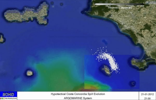 Lo scenario preso in considerazione prevede “un continuo rilascio di Bunker C Fuel Oil dalla Costa Concordia” ad un tasso di 0,014 m3/s nel corso di due giorni. “Si presume che tutto il carburante fuoriuscito sia a livello della superficie dell’acqua” spiegano i ricercatori di Argomarine.