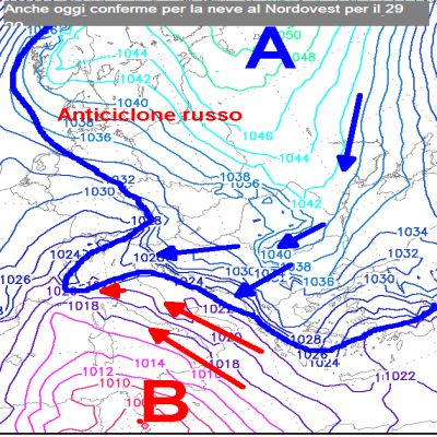 Sempre dalle colonne del suo sito personale da cui ormai si esprime quotidianamente, http://www.meteogiuliacci.it/, il meteorologo Mario Giuliacci ha aggiornato le previsioni meteo per i prossimi giorni focalizzando l’attenzione al weekend e pubblicando una mappa molto interessante, alla quale ha aggiunto un testo chiaro e preciso, che non lascia spazio a equivoci: “l’immagine della circolazione atmosferica prevista per 29 gennaio, conferma ancora uno scontro, proprio in Valpadana, tra l’aria siberiana inviata sulla Penisola dall’Anticiclone russo (zero termico ancora intorno 500 metri su Piemonte, Ovest Lombardia) e le tiepide e umide correnti sciroccali sospinte fino al Nord Italia da una profonda depressione centrata a Sud della Sicilia ma che abbraccia quasi tutta la penisola. Bisogna prendere atto che comunque questa favorevole disposizione dei centri barici per la neve al Nord è al limite. Possiamo infatti contare quasi con certezza sull’arrivo dell’aria siberiana in Valpadana il giorno 29 gennaio (meglio ancora nella notte tra il 28 e il 29) per merito della tendenza dell’anticiclone russo a resistere su una medesima area per lungo tempo. Ma non siamo altrettanto sicuri invece che la depressione africana mantenga immutata, secondo i modelli, anche nei prossimi giorni la posizione favorevole prevista per il 29. Basterebbe un piccolo spostamento più a Sud perchè il Nord venga tagliato fuori, così come basterebbe un suo piccolo spostamento verso il Basso Tirreno perchè la neve in pianura abbracci anche molte regioni centrali.Comunque ad oggi quella dell’immagine è la situazione più probabile per il 29 gennaio“.
