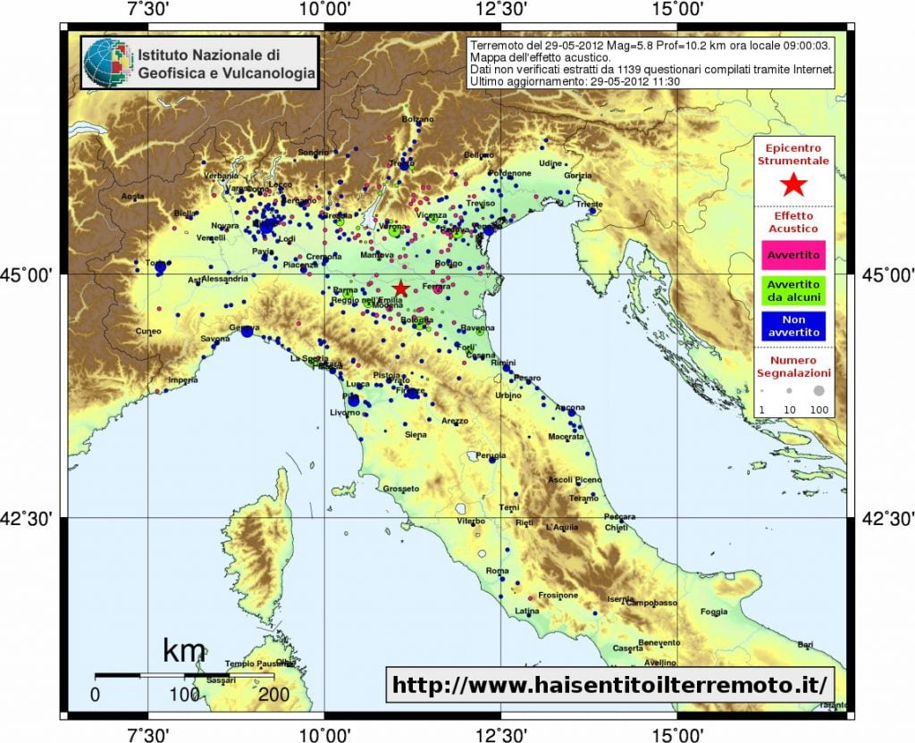 Continua a tremare con violenza la terra in Emilia Romagna, e le scosse vengono avvertite in tutto il nord Italia. La nuova scossa molto forte è stata di magnitudo 5.3 Richter a 6.8km di profondità alle ore 12:55, è stata avvertita in tutta la pianura Padana, anche a Milano. A Bologna la gente è scesa in strada. Panico nelle zone terremotate. Pochi minuti dopo, alle 13:00, c’è stata un’altra scossa di magnitudo leggermente inferiore, 5.1 Richter, a 11km di profondità. I dati non sono ancora stati resi noti dall’Ingv, che sta elaborando il responso dei sismografi installati sul territorio.