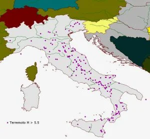 L’insegnamento di una mappa. L’Italia è terra di terremoti praticamente da sempre. A livello tettonico, lo scontro tra la placca africana e quella europea, iniziato 70 milioni di anni fa e tuttora in corso, porta la nostra penisola ad essere un centro preferenziale di grandi sconvolgimenti tellurici. A volte un’immagine spiega più di mille parole. Qui di seguito è rappresentata la distribuzione geografica dei sismi con magnitudo superiore a 5.5 verificatisi in Italia da 2300 anni a questa parte. Si ricorda che il valore di magnitudo pari a 5.5 spesso è preso come riferimento minimo teorico per il possibile verificarsi dei cosiddetti effetti di sito che portano ad amplificare i danni di un sisma causa particolari situazioni locali (litologia sfavorevole, frane, liquefazione, ecc.). Nel nostro caso si tratta, ovviamente, di una scelta soggettiva (e come tale non immune da critiche) ma comunque dettata dal voler testimoniare, una volta di più, come la ricerca possa aiutare a salvaguardare noi stessi ed il mondo in cui viviamo. Un semplice esempio che però, in maniera semplice ed intuitiva, permette di esprimere valutazioni significative anche se peraltro note.