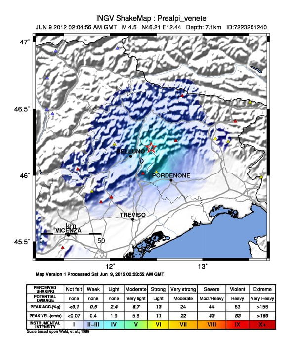 Continua a tremare la terra nel nord Italia: dopo le tante scosse che dal 20 maggio interessano la pianura Padana tra bassa Lombardia, Veneto sud/occidentale ed Emilia Romagna, nei giorni scorsi abbiamo avuto, all’alba di mercoledì, un terremoto di magnitudo 4.5 sul litorale ravennate e stanotte, pochi minuti dopo le 04:00, un’altra scossa sempre di magnitudo 4.5 sulle preAlpi orientali, al confine tra Veneto e Friuli Venezia Giulia, tra le province di Belluno e Pordenone. La scossa è stata abbastanza superficiale, ad appena 7km di profondità, ed è stata avvertita dalla popolazione di gran parte del nord/est, ma fortunatamente non ci sono stati danni.