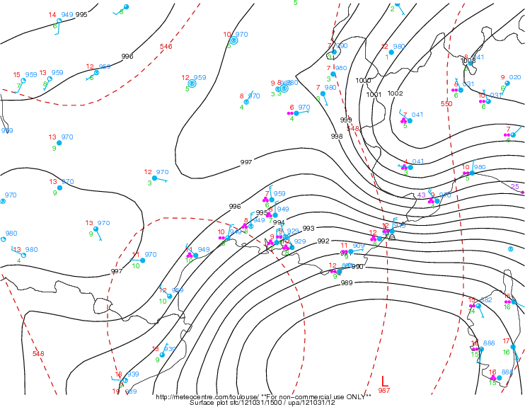 Con lo spostamento verso sud-sud/est accade che sulle coste liguri, in particolare lungo la Riviera di Ponente e sulla città di Genova, le correnti nei bassi strati si cominciano a disporre da N-NE o Nord, con l’avvento di sostenute raffiche di caduta dalle vallate appenniniche che accompagnano la tracimazione delle masse d’aria fredde padane, accumulate fra il cuneese, l’alessandrino e il piacentino, verso la costa ligure e il golfo di Genova. Il tutto mentre in quota (500 hpa), prevale un flusso portante da S-SO e SO, mite e molto umido, visto il posizionamento più occidentale del nocciolo depressionario nella media troposfera rispetto al minimo barico al suolo, che scorre al di sopra dell’aria molto fredda, nei bassi strati, che travasa dalla pianura Padana. I contrasti termici che si vengono a determinare producono una fitta nuvolosità, che risale da SO o S-SO, la quale da luogo a persistenti precipitazioni, che con l’ingresso dell’aria fredda nei bassi strati da N-NE, assumono prevalente carattere nevoso fin dalle quote collinari, fra savonese e la periferia occidentale di Genova. Ma quando dal cuneese, alessandrino e piacentino sfonda aria piuttosto gelida (che per più giorni è rimasta semi-stazionaria sopra i terreni innevati del basso Piemonte e ovest Emilia), le nevicate possono raggiungere persino le coste, imbiancando le città di Genova e Savona, regalando degli scenari davvero suggestivi.