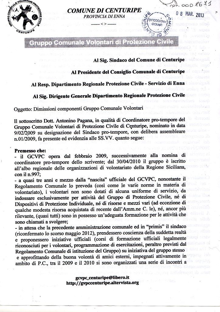 Il coordinatore del Gruppo comunale Protezione Civile di Centuripe, Antonino Pagana, rassegna le dimissioni contestualmente a 15 volontari. Dure le motivazioni che vanno dalla mancanza di uniforme di servizio, né di dispositivi di protezione individuale, né di risorse e mezzi vari. Molteplici sono gli adempimenti che una Amministrazione comunale deve curare per assicurare al servizio offerto dai volontari, ma come scrive il dott. Pagana, nonostante la continua insistenza del coordinatore, del segretario e di altri volontari, nel ribadire al sindaco che un gruppo di volontari efficienti e preparati è fondamentale per la comunità, pur riconoscendo la grave crisi economica in cui versa il comune, egli stesso (n.d.r.: il Sindaco), già autorità preposta di protezione civile nonché responsabile legale del Gruppo Comunale Volontari non ha mostrato la dovuta incisività e il dovuto interesse nel predisporre tutti gli atti, i passaggi e i processi necessari affinchè il gruppo potesse funzionare a dovere, manifestando, anzi, superficialità nella gestione del problema, anziché agire da sprone – tant’è che il numero dei volontari è calato progressivamente ed è venuto meno l’interesse e la buona volontà di quei pochi che ancora ci credono”.