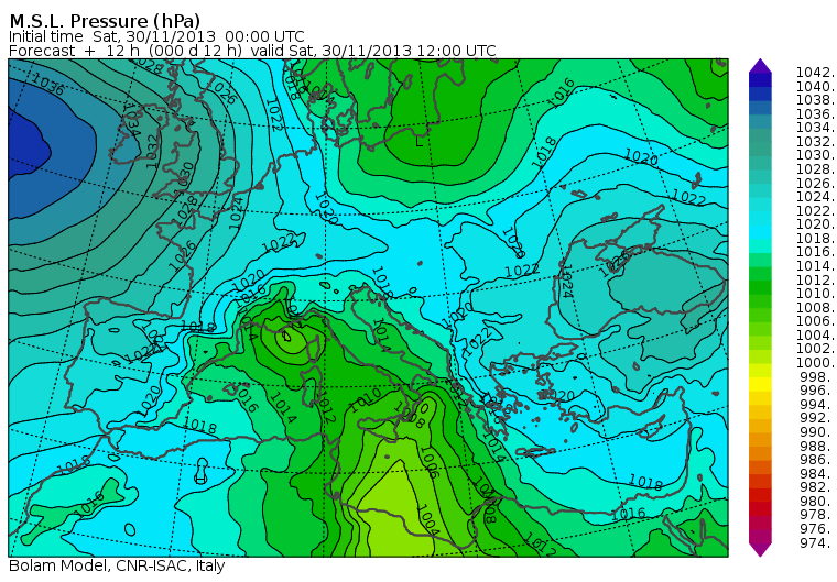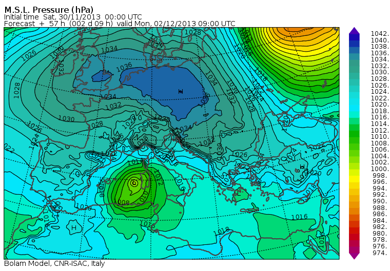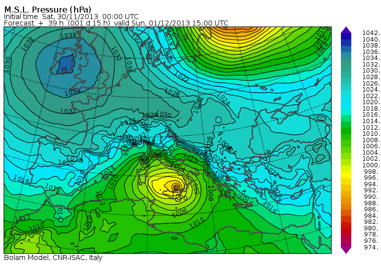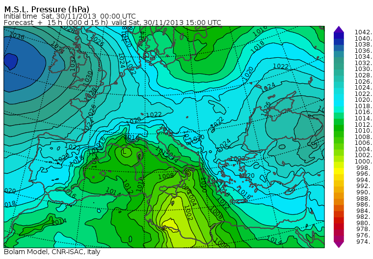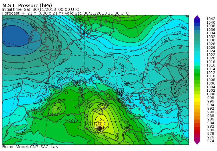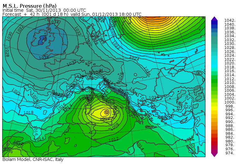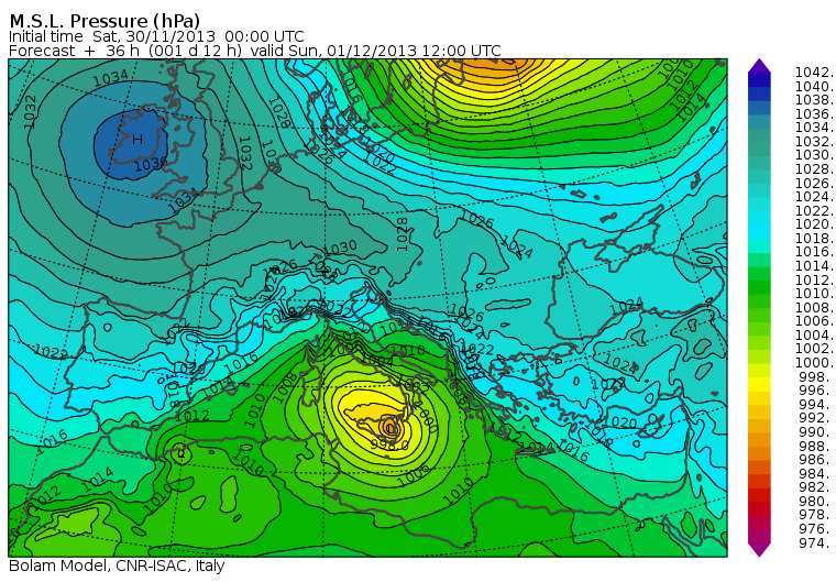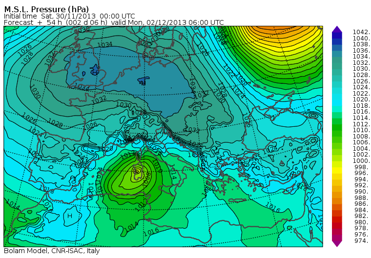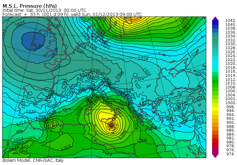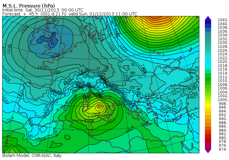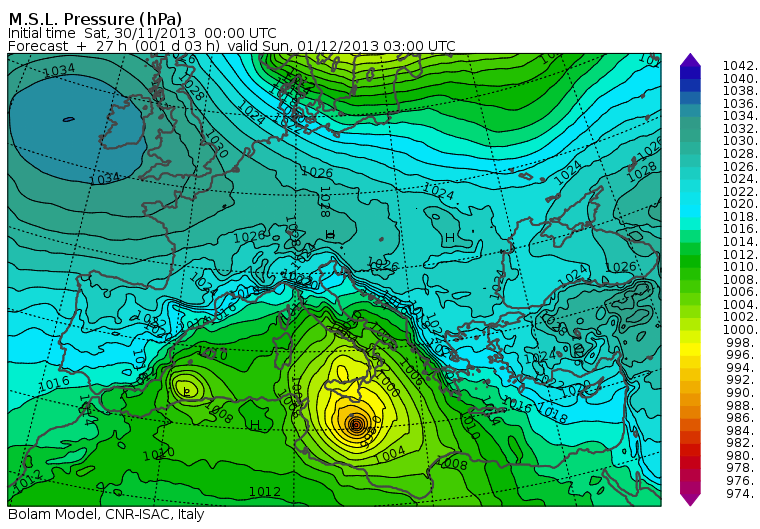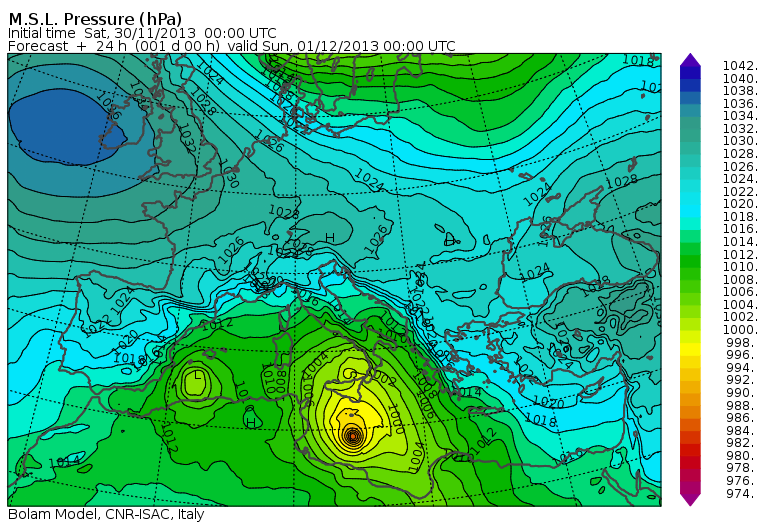 Il “Super-Ciclone” che nel weekend colpirà duramente l’Italia meridionale, sta nascendo in queste ore tra la Libia e il Mediterraneo centrale, come possiamo vedere dalle mappe del modello BOLAM a corredo dell’articolo. Il vortice depressionario, poi, risalirà il Canale di Sicilia già da stasera, avvicinandosi a Malta, con un nucleo di bassa pressione molto vicino ai 990hPa, un valore davvero considerevole se osserviamo l’alta pressione a 1028hPa sulle Alpi o anche i valori di 1010–1015hPa sull’Italia centro/meridionale: ecco perchè si attiveranno forti venti ciclonici con raffiche fino a 130–140km/h.