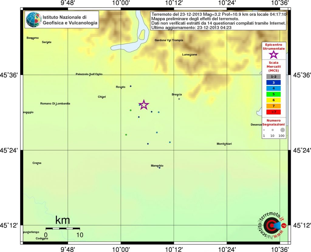 Una scossa di terremoto di magnitudo 3.2 e’ stata registrata alle 4:17 in Lombardia, in provincia di Brescia. Secondo i rilevamenti dell’Istituto nazionale di geofisica e vulcanologia (Ingv), il sisma ha avuto ipocentro a 10,9 km di profondita’ ed epicentro in prossimita’ dei comuni di Azzano Mella, Berlingo, Castegnano, Flero, Gussago, Longhena, Mairano, Ospitaletto, Passirano, Rovato e Trenzano. Non si hanno al momento segnalazioni di danni a persone o cose.