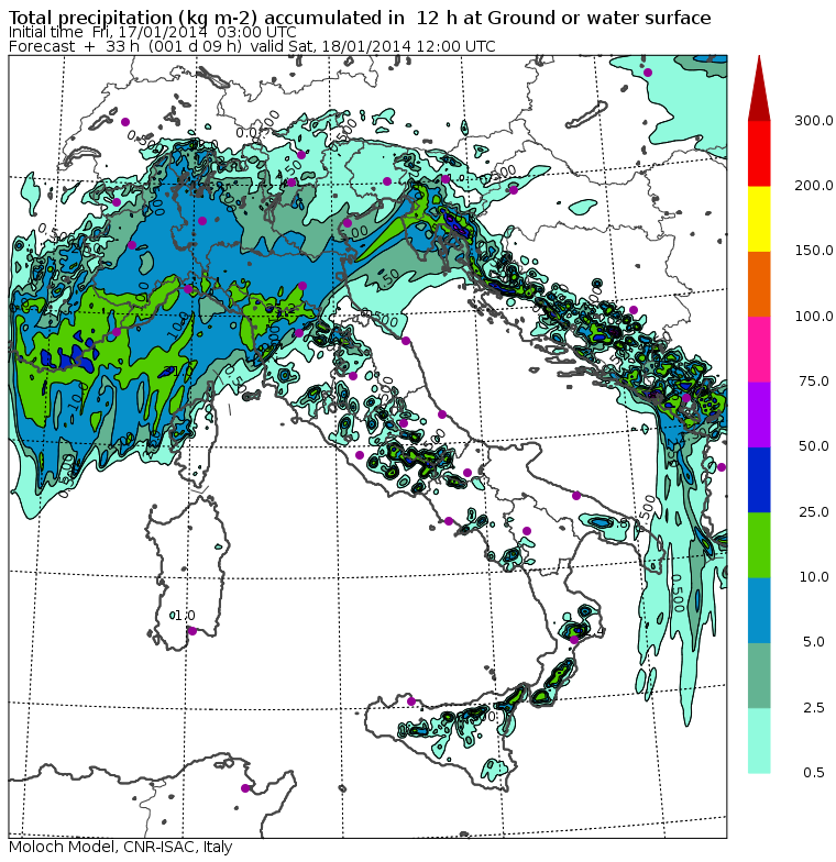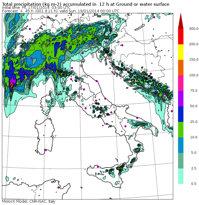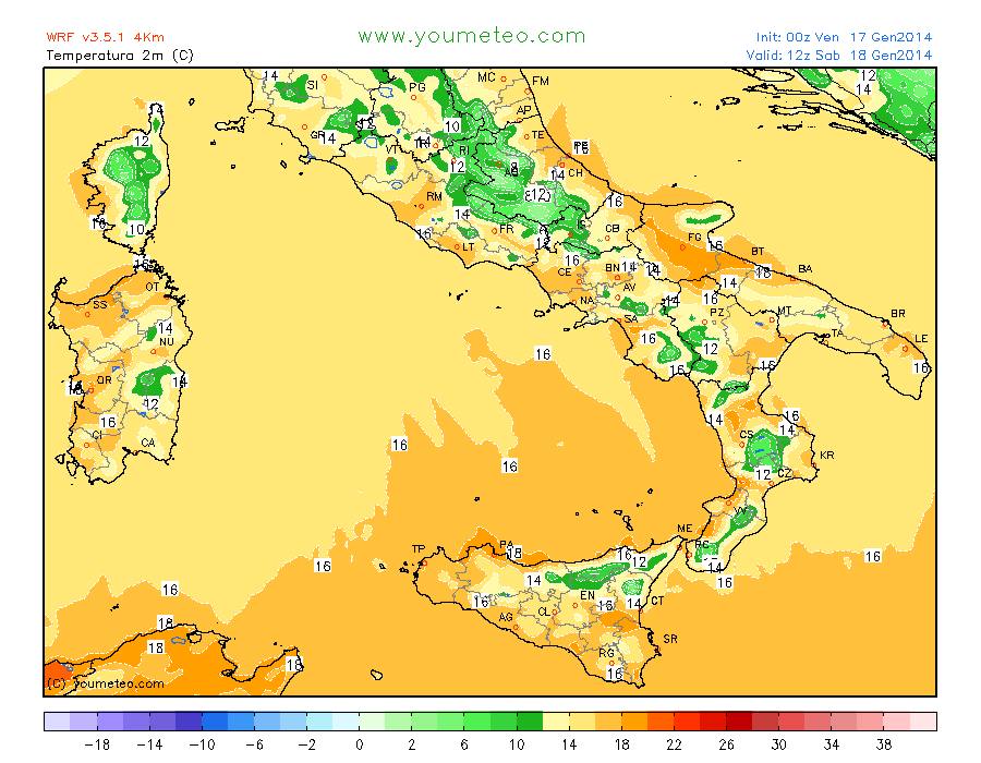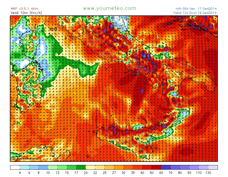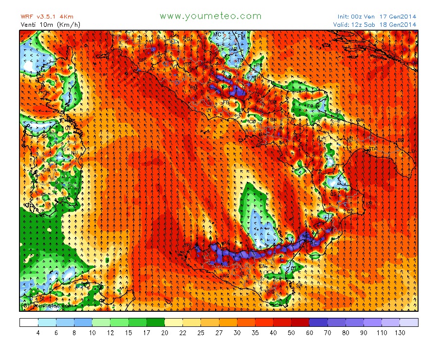 Dalle carte dei venti, fonte wrf 4km, relative al centro sud Italia si evince per la giornata di sabato un notevole rinforzo della ventilazione da scirocco con raffiche che sulla Sicilia settentrionale e la Calabria meridionale raggiungeranno gli 80km/h. Raffiche attorno ai 55km/h su tutto il versante tirrenico centro meridionale, la Puglia e la Sardegna. Complici le isoterme a 850hPa fino a 14°C sul nord della Sicilia e la forte componente compressiva adiabatica (elevate velocità verticali positive a 700hPa) tipica dei promontori anticiclonici con matrice sub tropicale le temperature massime supereranno localmente i 20°C sulla Sicilia settentrionale, specialmente palermitano. Temperature attorno ai 20°C anche sulla Puglia settentrionale e le coste molisane e abruzzesi. Temperature fino a 18°C/19°C sulla Sardegna, specie sassarese, e la Calabria.