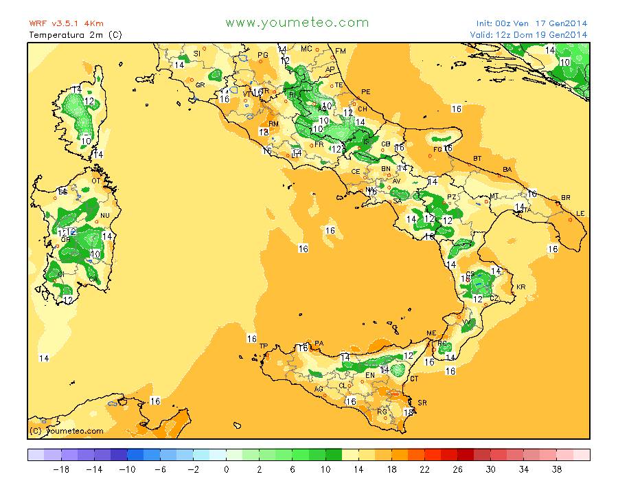 Non cambierà molto la situazione nella giornata di domenica, eccetto sulla Sardegna dove entrerà aria più fresca. Le temperature massime più elevate si raggiungeranno sul Lazio, sull’Abruzzo, Molise, Puglia, Calabria e Sicilia con picchi fino a 20°C.