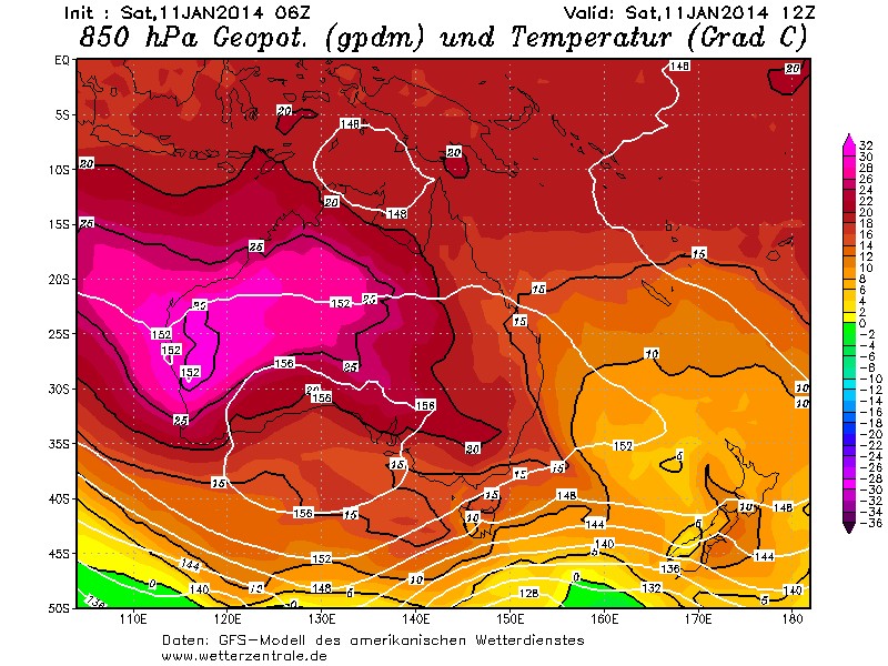 Una forte ondata di calore sta interessando l’Australia centrale ed occidentale. Nel continente è presente una vasta struttura anticiclonica, con massimi pressori attorno a 1020hPa sulle coste meridionali accompagnata da isoterme a 850hPa comprese tra 25°C e 30°C.