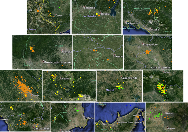 Molto attiva nel mese preso in esame la sequenza sismica nell’area del Bacino di Gubbio. Sono stati circa 1100 gli eventi registrati dalla Rete Sismica Nazionale solo a dicembre, tra i quali 7 di magnitudo compresi tra 3.0 e 4.0. In particolare nella seconda meta’ di dicembre si sono verificati i due eventi principali della sequenza: il terremoto di magnitudo ML 3.9 il 18 dicembre e il terremoto di magnitudo ML 4.0 del 22 dicembre entrambi risentiti a Gubbio ed in altri comuni della provincia di Perugia. Sono piu’ di 6.000 gli eventi registrati dall’inizio dell’anno in quest’area dell’Appennino Umbro-Marchigiano che ha un rilascio sismico pressoche’ continuo (approfondimento sulla sequenza). In tutto il mese di dicembre, moltissime le aree del territorio italiano che si sono attivate, con una piccola sequenza a Cuneo, un’altra a Brescia, due sequenze in Lunigiana (MC), una nel pistoiese, alcuni eventi in pianura padana (ancora repliche del terremoto del maggio 2012), una sequenza a sud di Sansepolcro (AR), la sequenza a Gubbio (PG), un’altra nei pressi di Amatrice (RI) e una al Gran Sasso, poi nell’area di Casacalenda in Molise, in quella dei Monti del Matese, del Pollino e un’altra poco a nord in Basilicata, alcuni eventi in provincia di Crotone, la sequenza nello Stretto di Messina, quella nel golfo di Patti e una a ovest dell’Etna, nei pressi di Bronte (CT).
