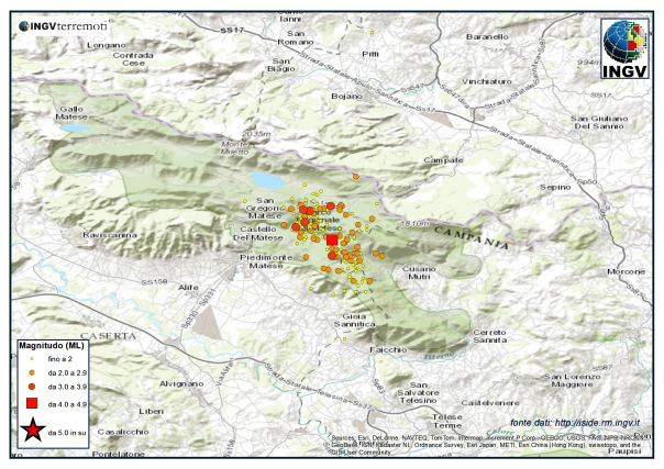 A dicembre sono stati 2.351 i terremoti registrati dalla Rete Sismica Nazionale dell’Istituto Nazionale di Geofisica e Vulcanologia (Ingv), una media di quasi 76 eventi al giorno, il doppio rispetto al mese precedente. Come spiega l’Istituto, nel mese appena trascorso sono stati molti gli eventi di magnitudo superiore o uguale a 4.0. In particolare l’evento del 29 dicembre ha avuto magnitudo ML 4.9 ed e’ stato localizzato tra le province di Caserta e Benevento, nei Monti del Matese. Dopo la scossa delle ore 18:08, risentita in gran parte della Campania e del Molise, sono stati registrati negli ultimi due giorni dell’anno altri 150 terremoti, la maggior parte dei quali di bassa magnitudo. La replica di magnitudo maggiore (ML 3.7) si e’ verificata circa 3 ore dopo l’evento principale.