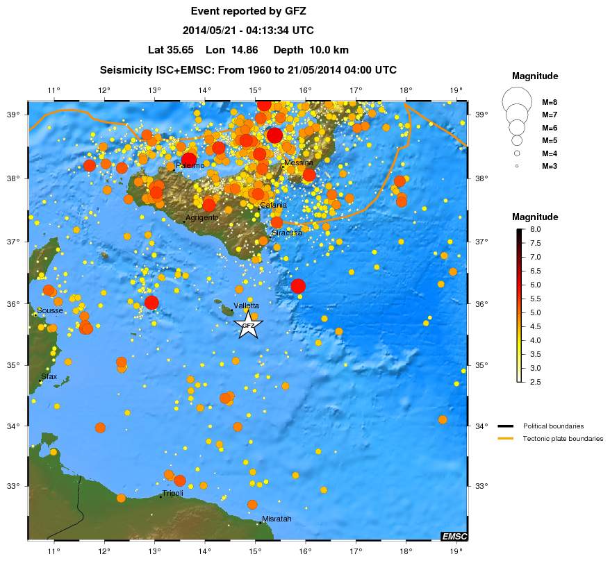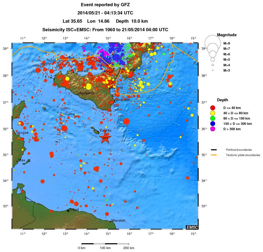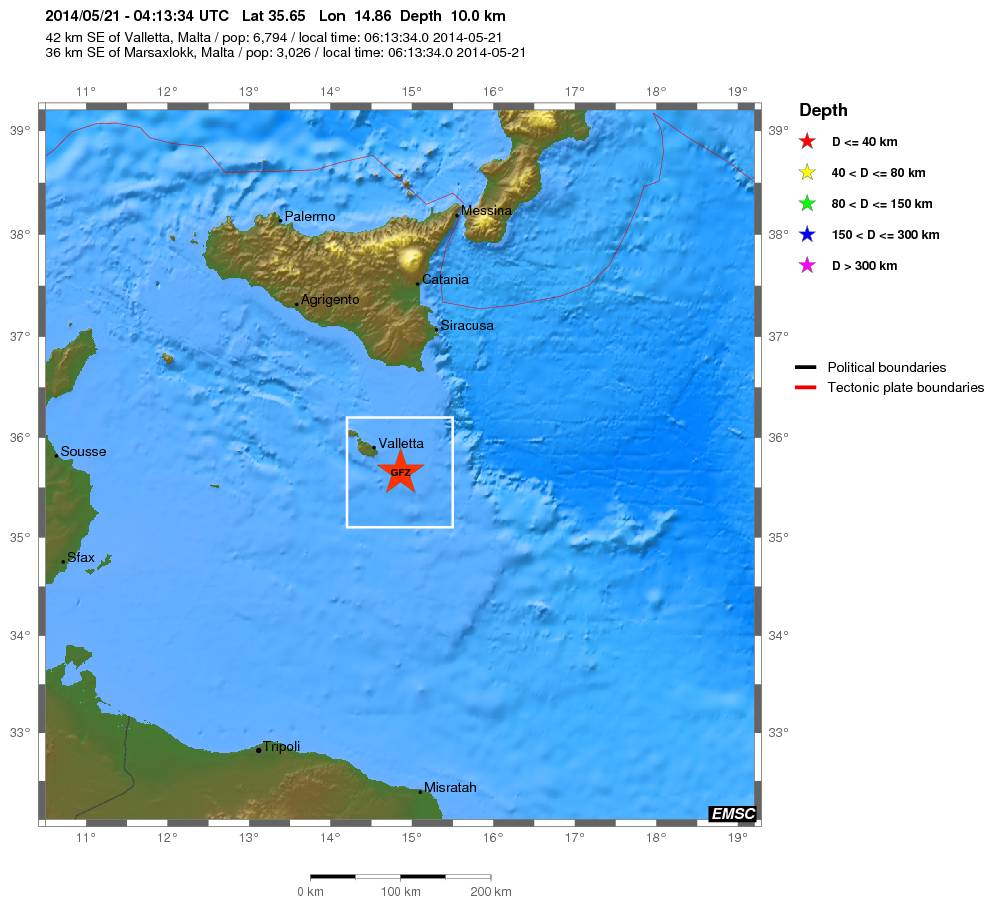 Stamattina alle ore 06:13 una scossa di terremoto di magnitudo 4.2 a 5km di profondità ha interessato il Canale di Sicilia, con epicentro appena a sud/est dell’isola di Malta, dove la popolazione ha potuto avvertire il movimento sismico. L’epicentro è stato esattamente 35km al largo dell’arcipelago maltese, dove non si sono verificati danni.