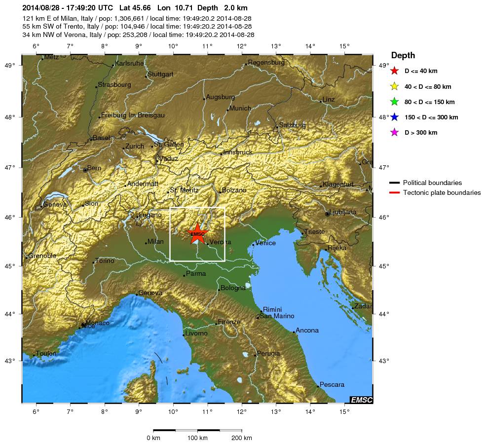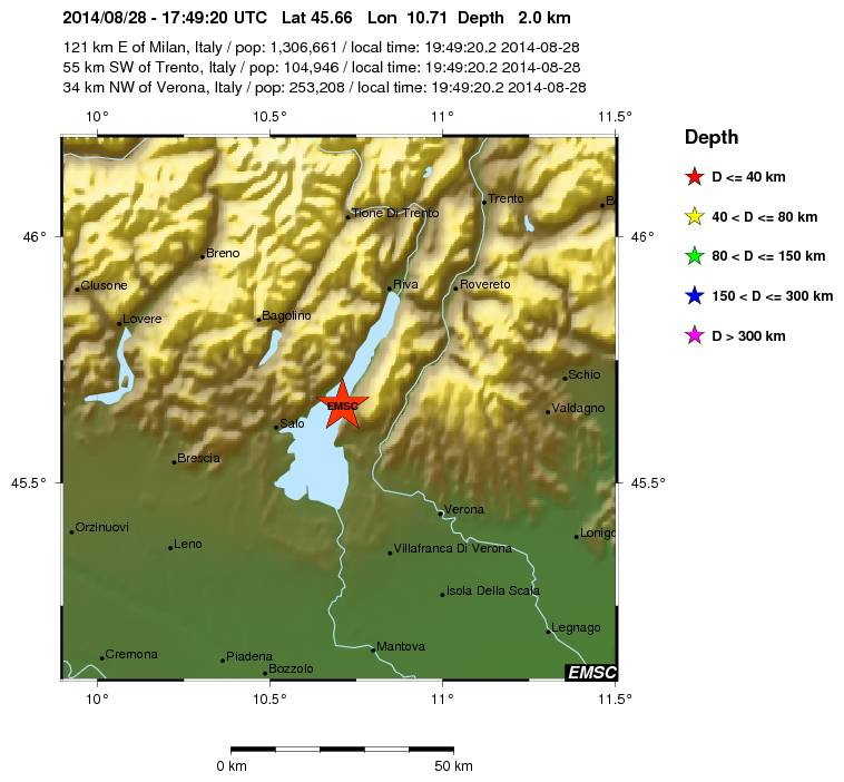 In attesa dei dati ufficiali dell’INGV, arrivano i primi riferimenti del terremoto che poco fa ha scosso il nord Italia. La scossa, secondo il CSEM-EMSC (Centro Sismico Euro/Mediterraneo) s’è verificata alle 19:49 con epicentro proprio nel Lago di Garda, ad appena 2km di profondità, proprio sotto il lago ed è stato abbastanza intenso, di magnitudo 4.3.