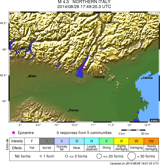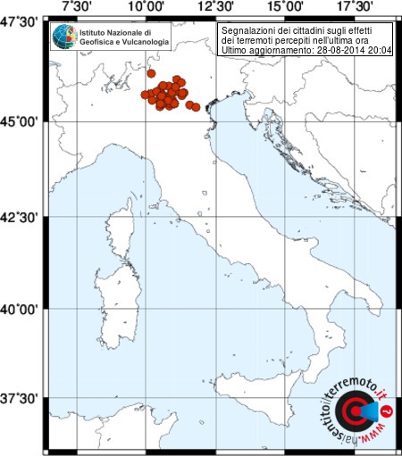 Dopo circa 20 minuti dalla scossa, il servizio dell’INGV “Hai Sentito il Terremoto” ha già ricevuto oltre 60 segnalazioni. Verona, Rovereto, Trento, Valdagno e Desenzano del Garda le località con maggior risentimento sismico.