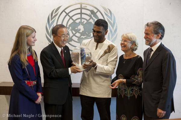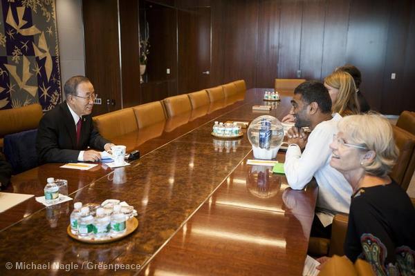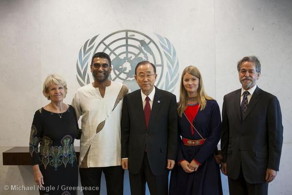 A pochi giorni dal summit Onu che si terra’ a New York martedi’ prossimo per discutere di cambiamenti climatici e a un anno dall’azione non violenta nel Mar di Pechora che, nel settembre del 2013, ha portato all’arresto e alla detenzione in Russia di 28 attivisti di Greenpeace e di due giornalisti freelance, il segretario generale delle Nazioni Unite Ban Ki-moon ha incontrato una delegazione guidata da Kumi Naidoo, direttore esecutivo di Greenpeace International, che ha consegnato i nomi dei sei milioni di persone che sino ad ora hanno aderito all’appello globale per la salvaguardia dell’Artico. “Ricevo queste firme come un impegno comune verso il nostro comune futuro, per proteggere il nostro ambiente, non solo nell’Artico, ma su tutto il Pianeta- afferma il segretario generale dell’Onu- L’Artico e gli oceani sono la nostra ancora di salvezza e la fonte del nostro futuro.