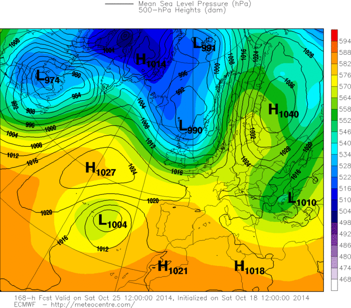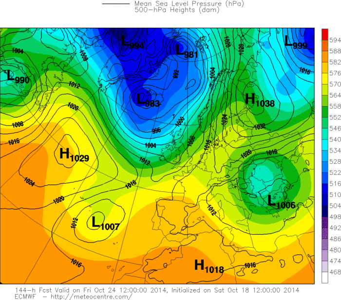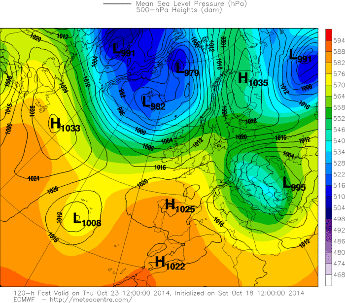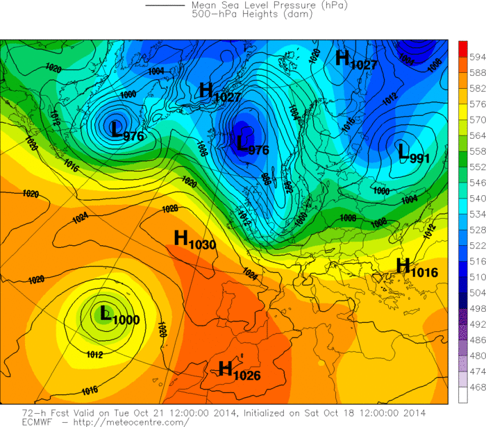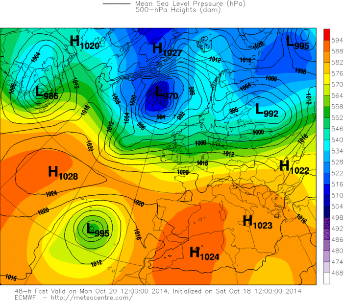 Ovviamente bisogna attendere ancora per capire quale sarà il reale percorso intrapreso da Gonzalo una volta raggiunta l’Europa centrale: non è un episodio che capita tutti i giorni, ed è quindi normale che per saperlo “leggere” nel modo migliore possibile, i modelli devono elaborare dati particolarmente approfonditi e la previsione si potrà considerare pienamente affidabile solo poche ore prima dell’evento. Chi pensava di poter individuare i dettagli di un peggioramento così delicato, con tanti giorni d’anticipo, evidentemente non ha chiare le regole basilari della meteorologia, una scienza inesatta per definizione e così tanto suggestiva e affascinante proprio per la sua caratteristica di imprecisione. Aspettiamo ancora, quindi, per esprimere le definitive “sentenze” sull’evoluzione meteorologica della settimana entrante, senza dimenticare che fino a pochi giorni fa, quando ancora l’uragano Gonzalo non era neanche nato nel cuore dell’oceano Atlantico, le previsioni meteo per i prossimi giorni del mese di ottobre disegnavano un anticiclone infinito sull’Italia, senza alcun peggioramento, senza alcun calo termico, ma con un infinito periodo di sole e caldo che non si sarebbe interrotto fino alla fine del mese. Poi è arrivato Gonzalo, un mostro che ha raggiunto la 4^ categoria sulla scala Saffir-Simpson a ridosso dell’arcipelago delle Bermuda e che domani arriverà in Europa, a rimescolare le carte ed “accendere” l’evoluzione meteorologica anche per quello che sembrava un periodo assolutamente monotono e ancora una volta tipicamente estivo. Se colpirà in pieno l’Italia o la sfiorerà soltanto, comunque merita ogni tipo di attenzione per la sua tenacia che lo porterà a superare molti record storici relativamente alla longevità e alla traiettoria di una tempesta tropicale oceanica che dall’Atlantico arriva in Europa senza fermarsi alle isole Britanniche.
