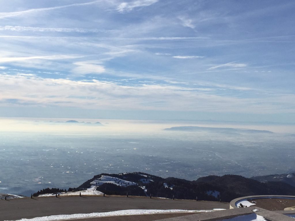 Mentre il sud Italia è sepolto dalla neve, il nord Italia è rimasto ed è ancora sotto l’influenza del “mite” anticiclone delle Azzorre. In realtà grazie alle inversioni termiche in pianura Padana continua a fare molto freddo, con temperature minime abbondantemente sotto lo zero e temperature massime di pochi gradi sopra lo zero termico, infatti la neve caduta al suolo una settimana fa resiste ancora. Ma in montagna, sulle Alpi e sull’Appennino nord/occidentale, soprattutto in Liguria, fa decisamente caldo. Sul monte Grappa, a 1.760 metri di altitudine, stamattina c’erano +6°C mentre a valle la colonnina di mercurio registrava -3°C. Spettacolari le foto inviateci proprio dalla cima del monte Grappa da Cristian Schena, che ci segnala come nella foschia della pianura padana spiccano i colli Euganei e quelli Berici: