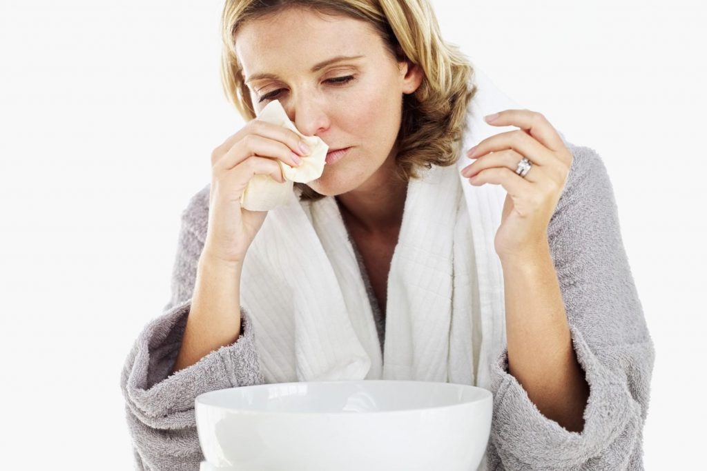 SUFFUMIGI: dopo aver fatto bollire una pentola d’acqua, il malato deve posizionarsi su di essa, coprendosi la testa con un asciugamano e deve ispirare a lungo i vapori caldi. Nell’acqua si possono mettere: bicarbonato di calcio, sale grosso, aceto bianco, fiori secchi di camomilla, olio essenziale d’eucalipto, foglie di menta, il limone o l’arancia amara, il rosmarino ecc.; tutte sostanze con proprietà antisettiche, antinfiammatorie, espettoranti, decongestionanti e disinfettanti.