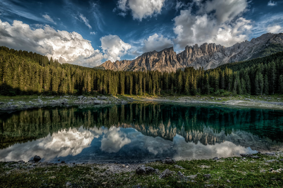 Lo stregone, sicuro di averla ormai in pugno, iniziò a correre giù dalla montagna, dimenticando di trasformarsi in mercante e venendo riconosciuto dalla ninfa che, con un salto, si inabissò nel lago. Lo Stregone fu subito entusiasta del piano e quello stesso giorno costruì l’arcobaleno più bello che Lo Stregone fu tanto preso da una tale furia che sradicò gli alberi, scagliò pietre e macigni nel lago e alla fine prese l’arcobaleno lo straccio in mille pezzi e lo gettò nell’acqua. Poi tornò sulla sua montagna e non si fece mai più vedere. Intanto però i colori dell’arcobaleno si erano sciolti sulla superficie dell’acqua e lì sono rimasti fino ad oggi. Il lago di Carezza viene alimentato da sorgenti sotterranee che portano l’acqua dalle cime del Latemar.