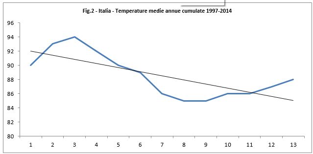 Si stanno insomma attuando le due ipotesi che vedono il sole in fase di stanca, con emissione di energia sempre più debole (fig.1.) che conseguentemente da’ il via alla seconda ipotesi e cioè: meno macchie uguale a temperature globali (nel caso in esame lo stato termico è riferito alla nostra penisola con la fig. 2.) molto ma molto meno calde rispetto ai valori attuali, evidenziate proprio dalla linea nera di tendenza in decisa discesa come si può notare sempre nella fig. 2 stessa.