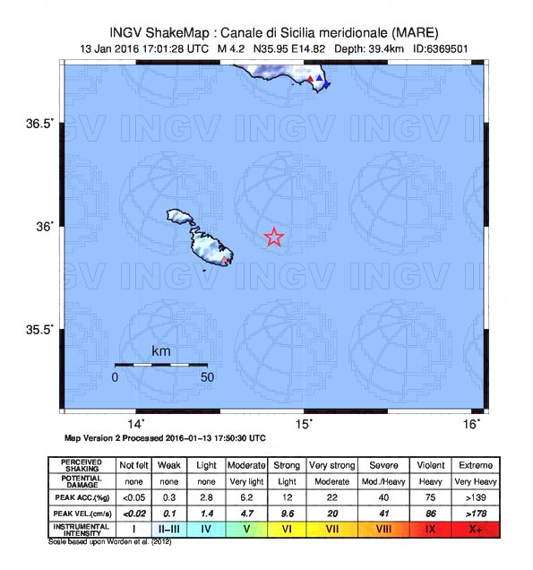 Grazie al prezioso lavoro di Giovanni Falcicchia, pubblichiamo la scheda con gli effetti macrosismici del terremoto di magnitudo 4.2 che si è verificato alle 18:01 di oggi pomeriggio nel Canale di Sicilia tra Malta e la Sicilia.