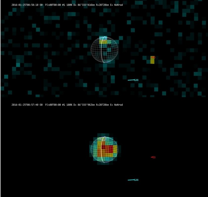 «Le riprese, anche se ottenute da una distanza così elevata, dimostrano già l’ottimo funzionamento di JIRAM, nella prospettiva dell’inizio della missione osservativa vera e propria» commenta Alberto Adriani, dell’INAF-IAPS, principal investigator dello strumento. «JIRAM è stato fatto funzionare anche in assenza delle informazioni sul puntamento che invece saranno a sua disposizione durante la missione e subito dopo l’inserimento in orbita».