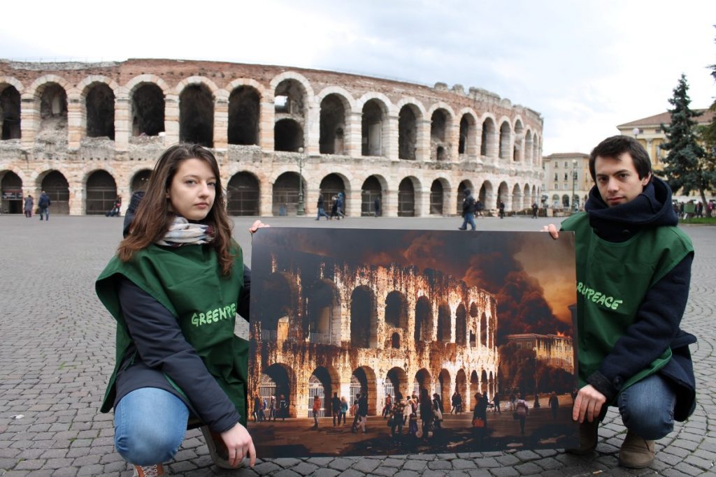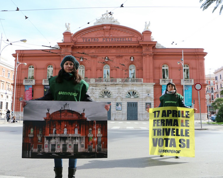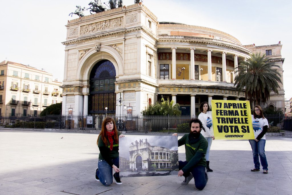 Oggi i volontari di Greenpeace sono entrati in azione in 25 citta’ di tutta Italia, tra cui Reggio Calabria (vedi foto a corredo dell’articolo), per sensibilizzare l’opinione pubblica sul referendum del 17 aprile, quando gli italiani saranno chiamati a esprimersi sulle trivellazioni in mare. Oltre a informare i cittadini, i volontari di Greenpeace hanno fatto un blitz all’Arena dello Stretto “Ciccio Franco” sul Lungomare della città, mostrando un’immagine “petrolizzata” e surreale di uno dei luoghi piu’ iconici e famosi della città, la statua di Athena, per diffondere un chiaro messaggio: “L’Italia non si trivella”, come recita il titolo stesso della campagna dell’associazione ambientalista. Le immagini dell’Italia sporcata dal petrolio – realizzate grazie al contributo del digital artist Olmo Amato – sono una provocazione con la quale Greenpeace intende mostrare l’incompatibilita’ tra la nostra identita’ e la nostra cultura e la strategia energetica del governo. L’idea di mostrare un volto sfigurato dei monumenti delle nostre citta’ serve anche a chiarire che in gioco non ci sono “solo” il mare e le comunita’ costiere: la minaccia riguarda tutti gli italiani, anche quelli che vivono nei centri urbani lontani dalle coste. Le trivelle sono incompatibili con la bellezza del nostro Paese, che rappresenta l’unico vero petrolio dell’Italia.