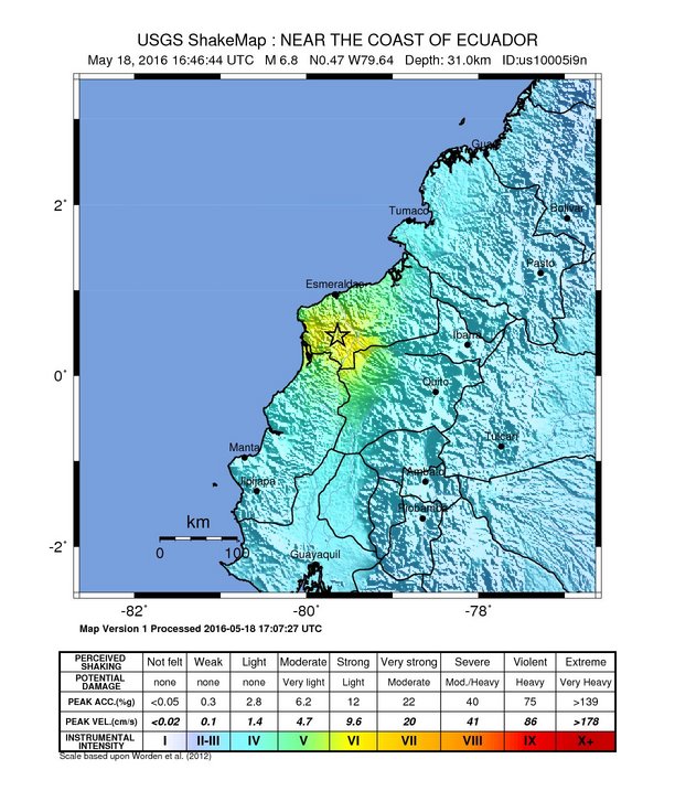 Un nuovo violentissimo terremoto ha colpito l’Ecuador pochi minuti fa: la scossa, di magnitudo 6.8, s’è verificata alle ore 18:46 italiane, le 11:46 locali. L’ipocentro del sisma è stato a 24km di profondità, in un’area densamente popolata. Al momento non si hanno notizie sulle conseguenze del sisma sulla popolazione. Intanto è scattata l’allerta tsunami. La notte scorsa una scossa di magnitudo 6.7 ha colpito la costa causando lievi danni nella stessa regione dove un sisma di potenza 7.8 lo scorso mese aveva ucciso oltre 650 persone.