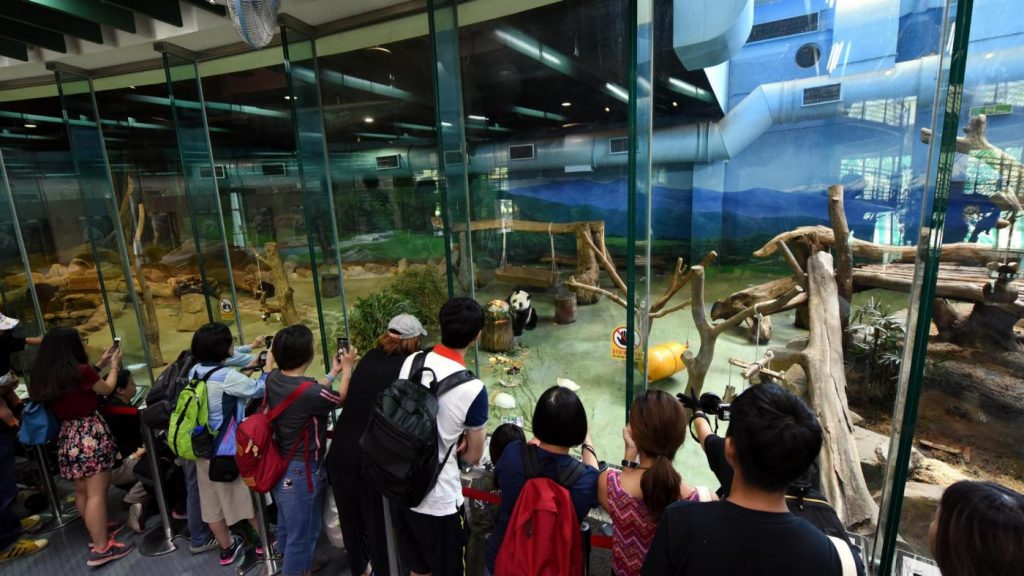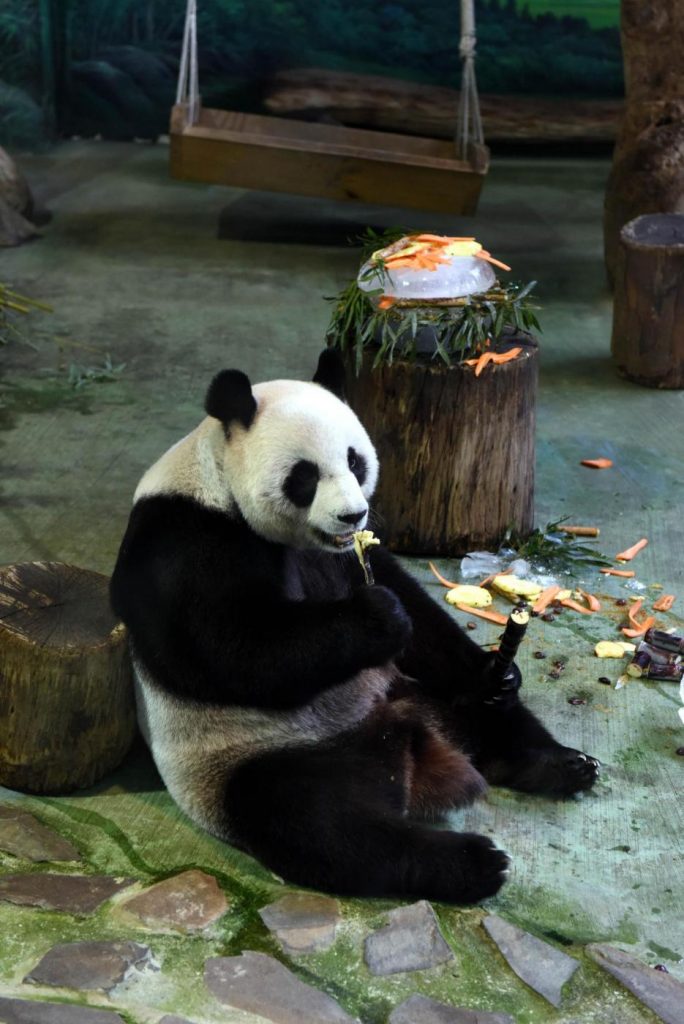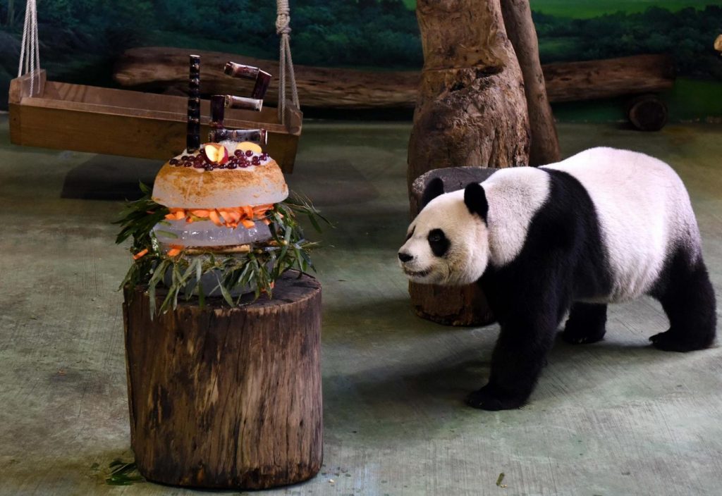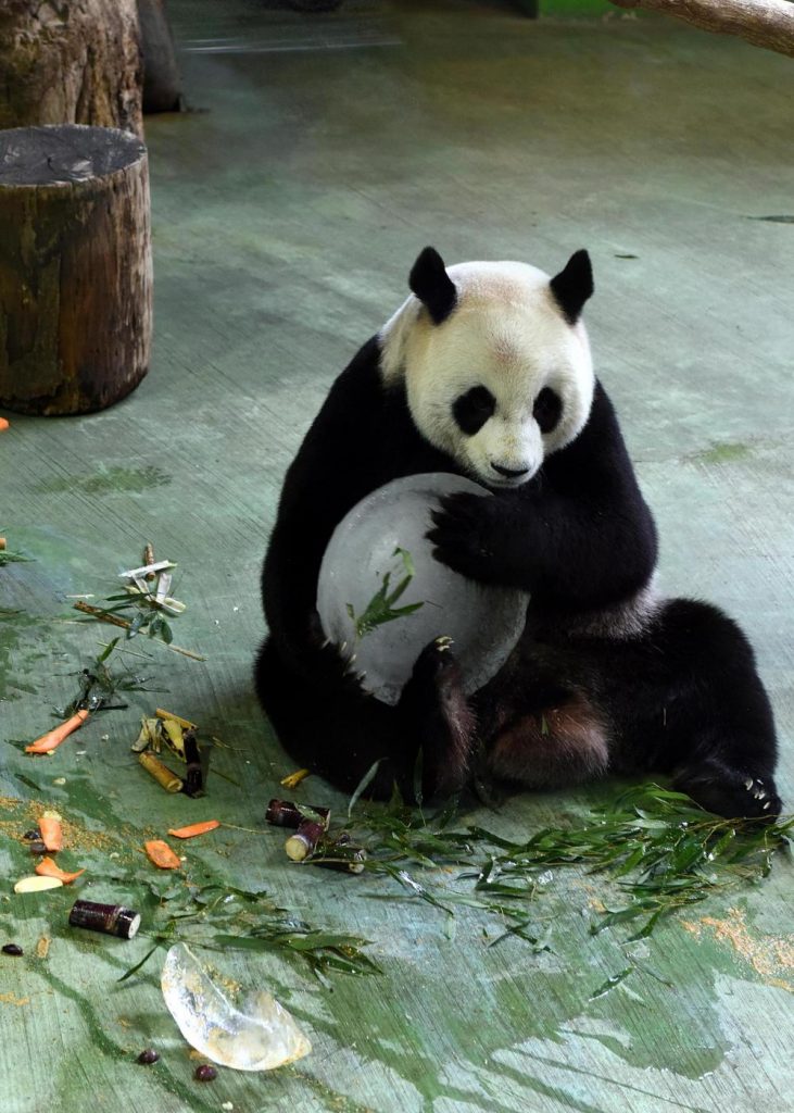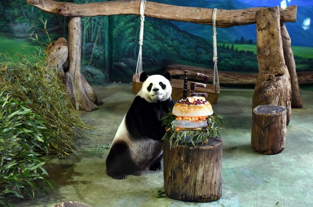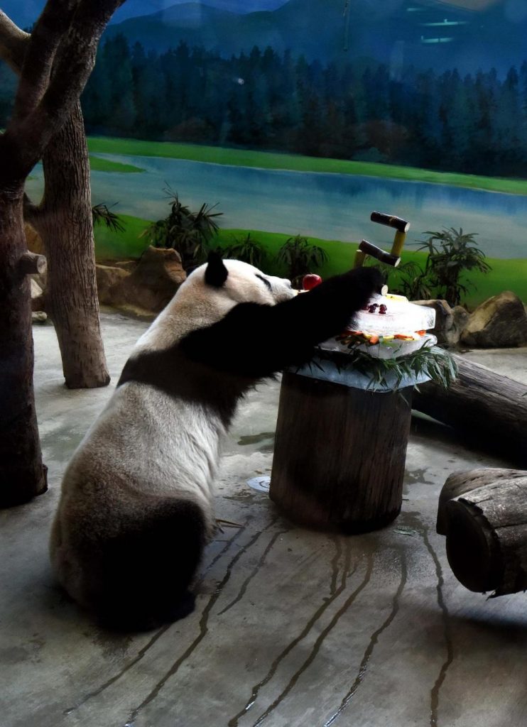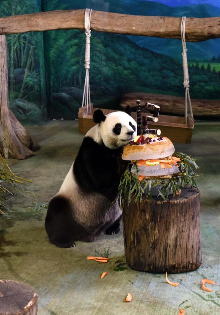 Il panda gigante Tuan Tuan ha ricevuto una torta di compleanno speciale allo zoo di Taipei, Taiwan, oggi 30 agosto 2016: celebra il suo 12° compleanno, a pochi giorni di distanza dal panda gigante Yuan Yuan.