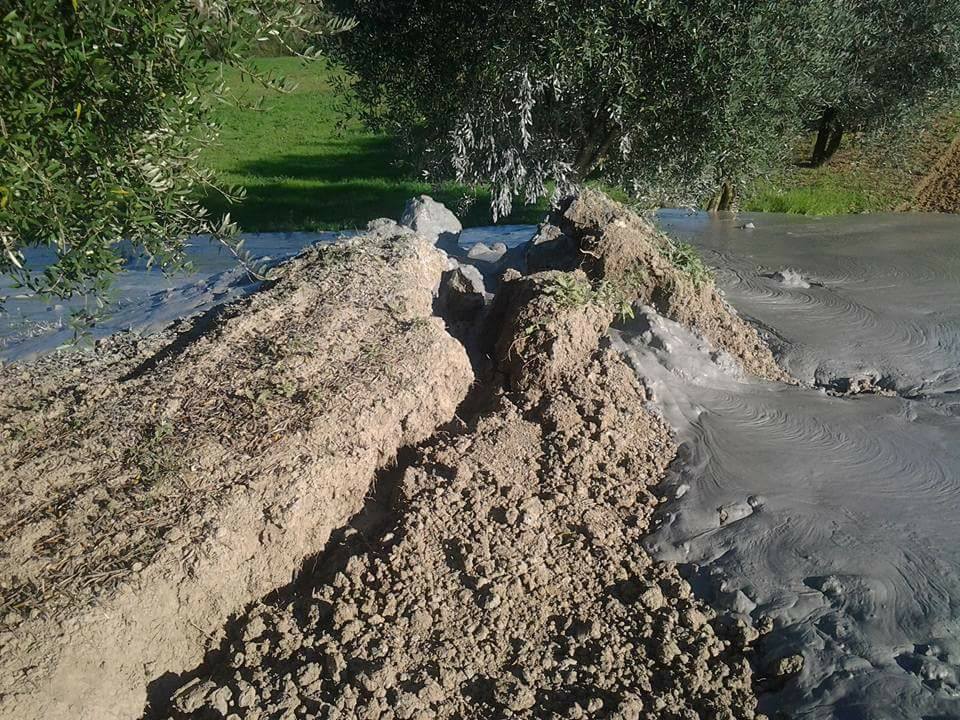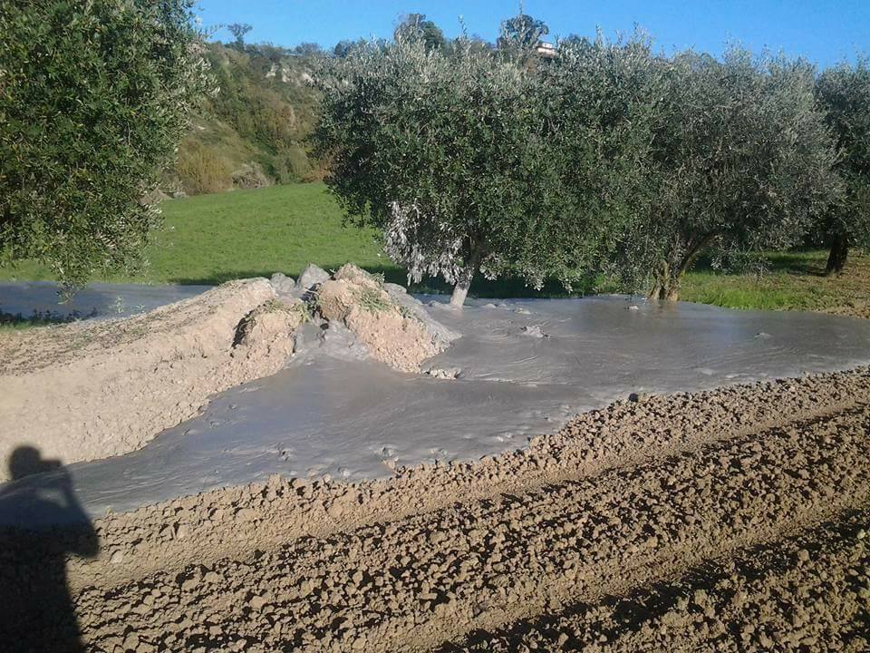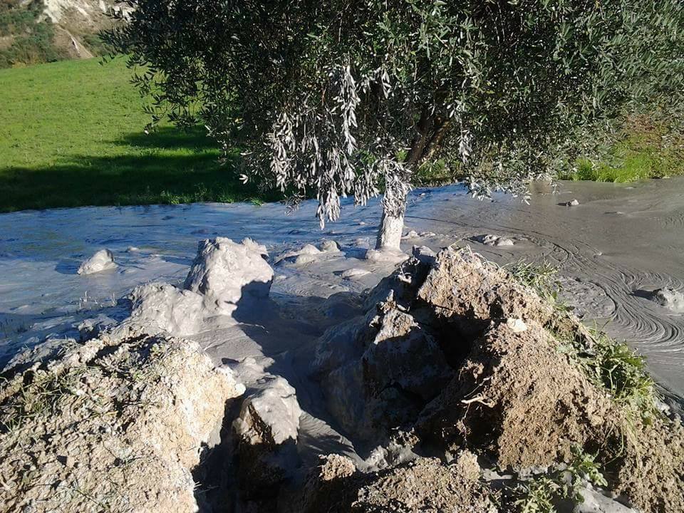 Santa Vittoria in Matenano è un piccolo comune collinare della provincia di Fermo, nel sud delle Marche: oggi pomeriggio alle 14 nelle campagne dell’Appennino nel territorio di questo comune è successo un episodio incredibile, anche se possiamo considerarlo relativamente “normale” in relazione al forte terremoto di magnitudo 6.5 di domenica mattina. Il suolo all’improvviso s’è aperto per l’impeto dei “fiumi” di fango e argilla in risalita dal sottosuolo: è nato così un nuovo vulcanello di fango nelle campagne del paese, con vere e proprie “inondazioni” fangose. Sul posto gli uomini della protezione civile che monitorano la situazione.