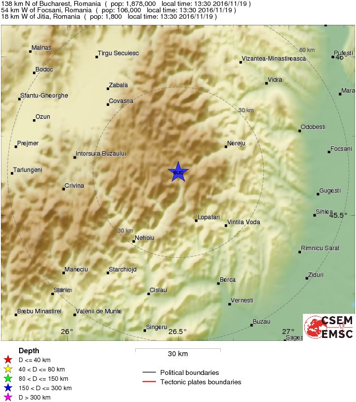 Una nuova scossa di Terremoto è stata registrata alle 12.30 in Romania. La scossa di magnitudo 4.4 ha avuto una profondità di 150 Km. L’epicentro è stato localizzato a Comuna Gura Teghii (BZ), come si evince dalle mappe. La scossa è stata molto profonda, si attendono aggiornamenti.