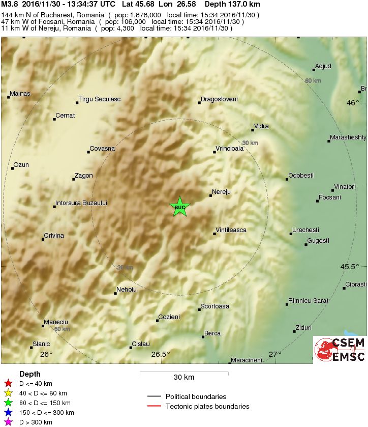 Dopo la forte scossa (di magnitudo 4.5) che ieri sera ha colpito la Polonia meridionale provocando 2 morti e 6 dispersi in una miniera, alle 14:34 italiane di oggi una nuova scossa di terremoto ha interessato l’Europa orientale, stavolta più a Sud, in Romania con epicentro nel piccolo comune di Nereju, ubicato nel distretto di Vrancea. La scossa è stata di magnitudo 3.8 e in base alle prime informazioni non ha fortunatamente provocato alcun danno.