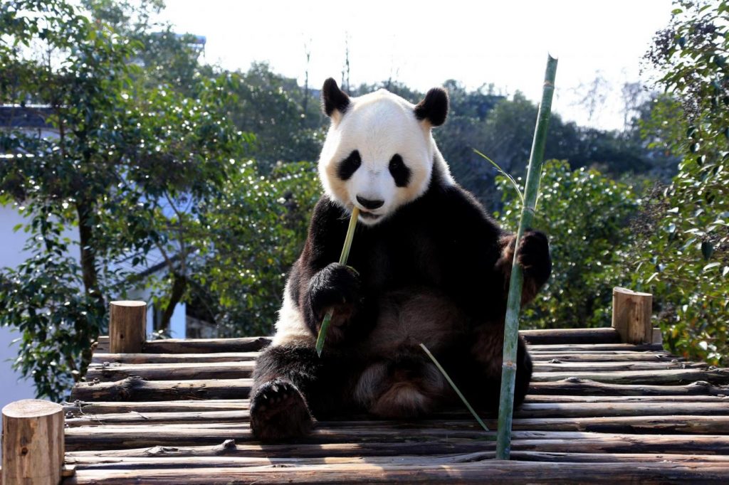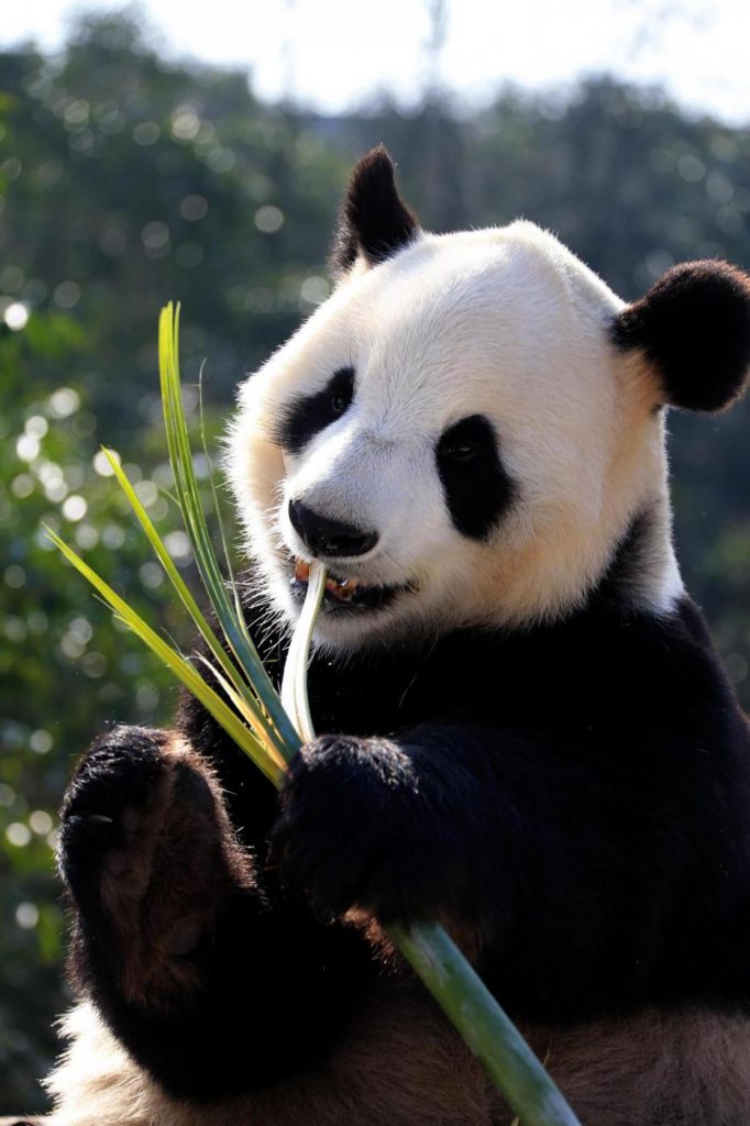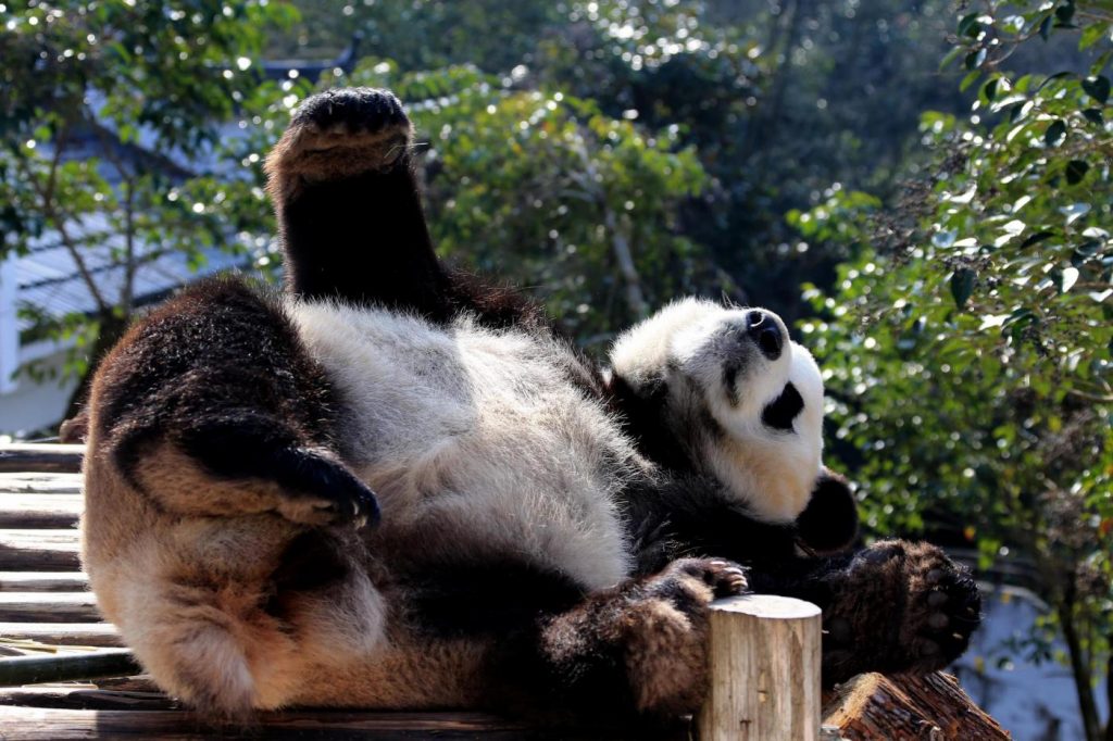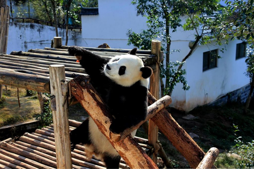 Il panda gigante gioca nel Xiuning Panda Park di Huangshan, nella provincia cinese di Anhui.