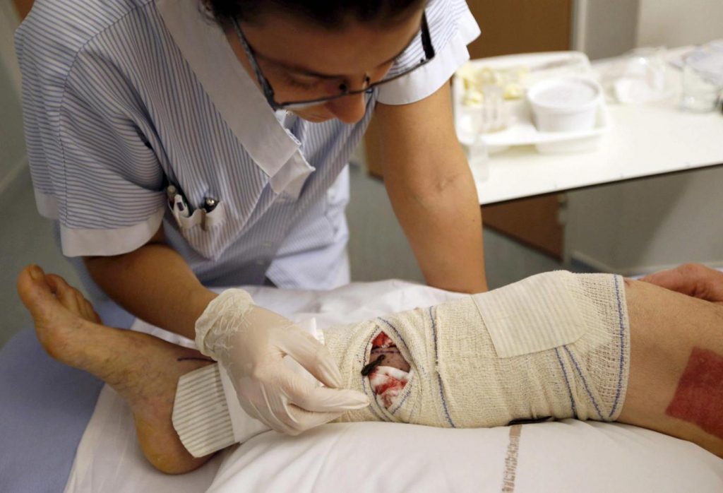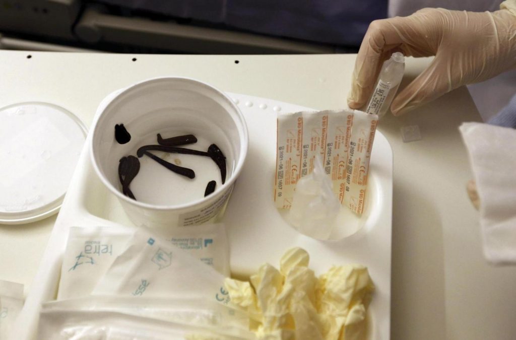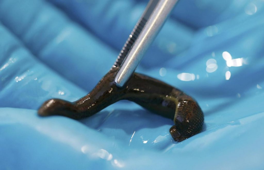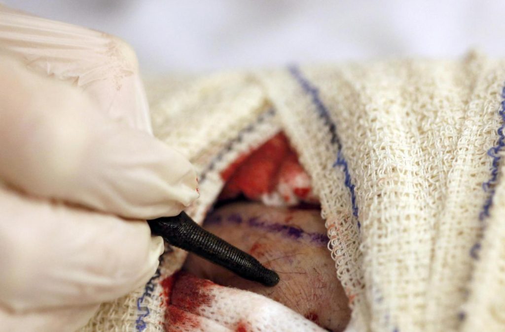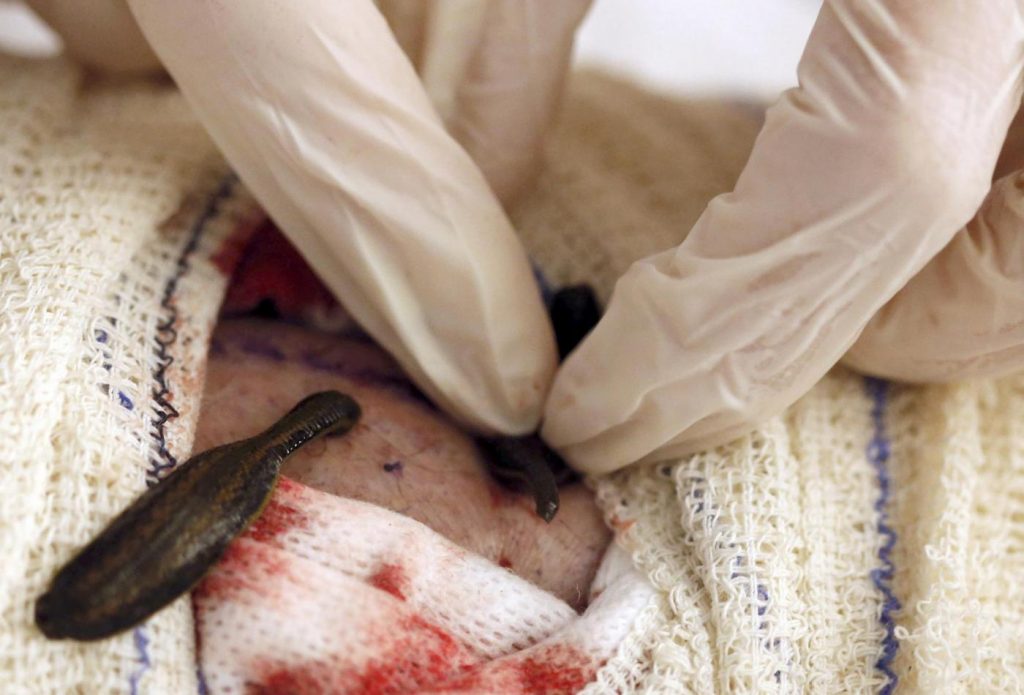 Nelle foto viene illustrato il procedimento eseguito presso l’ospedale CHU di Bordeaux, Francia. Le sanguisughe (Hirudo medicinalis) vengono impiegate su pazienti con ustioni: questi invertebrati lunghi in media 3 cm sono stati considerati indispensabili lo scorso secolo per trattare flebite e osteoartrosi, mentre oggi sono considerati molto efficaci in chirurgia plastica.