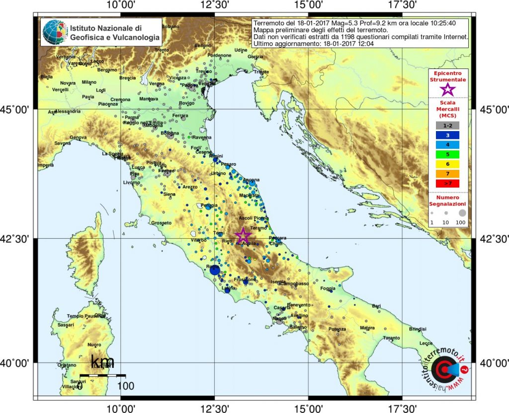 Scosse di Terremoto sentite da Ravenna a Foggia: sono le prime indicazioni che arrivano dal progetto “Hai sentito il Terremoto?” dell’Istituto Nazionale di Geofisica e Vulcanologia (Ingv). La sequenza di forti scosse che hanno colpito il Centro Italia sono state avvertite chiaramente a Roma come un Terremoto del terzo grado della scala Mercalli. “I dati sono ancora preliminari – ha spiegato Patrizia Tosi, dell’Ingv – al momento abbiamo le testimonianze di 1500 persone in tutta Italia ma i dati sono in rapidissima crescita”. La mappa della percezione e’ per ora incompleta, a macchie di leopardo, e solo nelle prossime ore si avra’ chiarezza su come le scosse siano state percepite nel territorio italiano. “Per ora – ha aggiunto Tosi – i dati in arrivo dalle zone vicino all’epicentro sono molto sparsi e indicano una scossa percepita del sesto grado della scala Mercalli. Le scosse sono state avvertite al nord fino a Ravenna e Forli’ e qualche testimonianza e’ arrivata anche fino dalla zona di Foggia”.