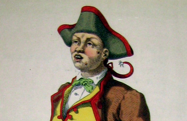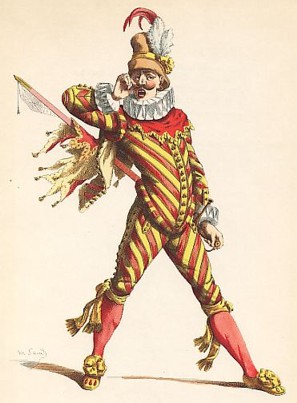 PIERROT: furbo ma gran romanticone, è l’unico personaggio che preferisce ad un piatto di minestra una romantica serenata, eseguita sotto la finestra della sua amata con la mandola. Forse è per questo che è pallido e languido e spesso gli scende una lacrima sul viso. Indossa pantaloni di seta lucida bianca, un ampio colletto, una lunga casacca decorata con grossi bottoni neri, papalina sul capo. Pierrot è il simbolo dell’innamorato malinconico e dolce ed è anche il più intelligente dei servi, svelto nel linguaggio, che critica gli errori dei padroni e spesso finge di non capire i loro ordini, eseguendoli al contrario perché li ritiene sbagliati. Riesce a risolvere anche le situazioni più ingarbugliate poiché capace e pieno di buon senso.