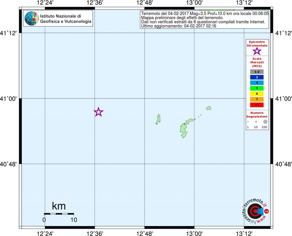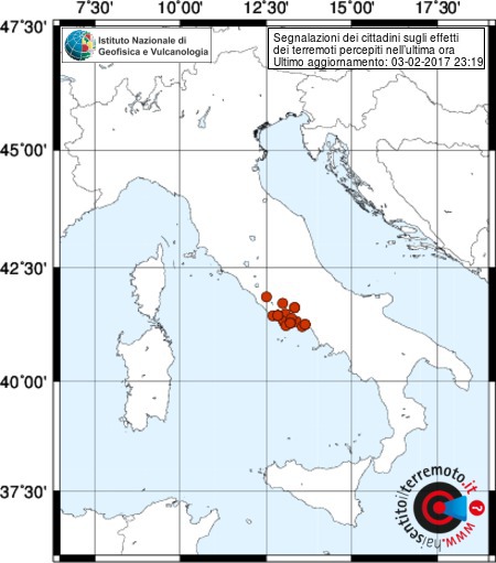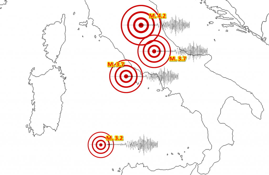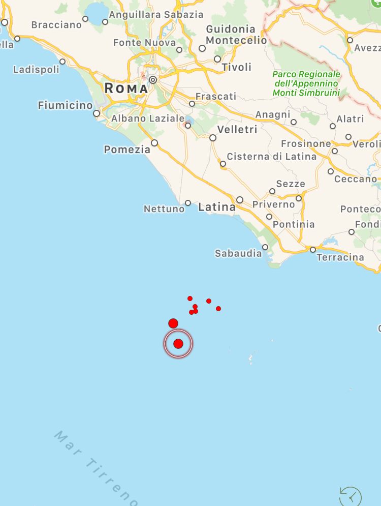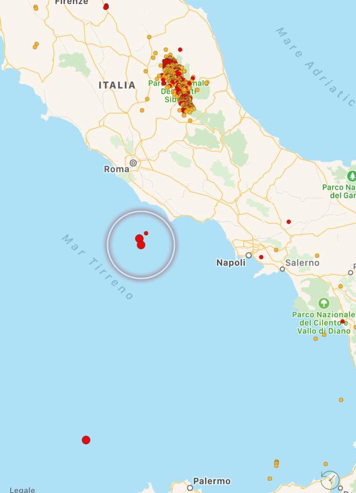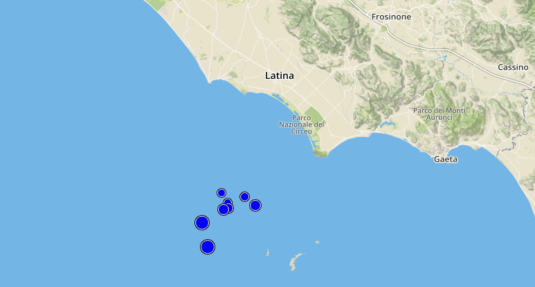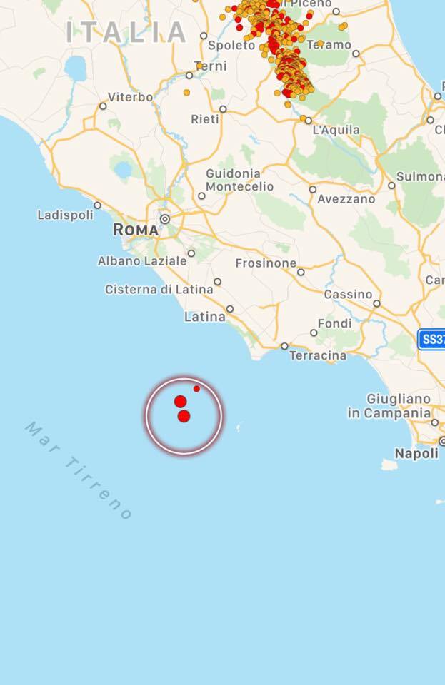 Le scosse principali si sono verificate in due aree: sull’Appennino centrale e sul litorale Laziale, con epicentro a ridosso dell’isola di Ponza dove le due scosse più forti (magnitudo 3.7 e magnitudo 3.5) hanno raggiunto il 5° grado Mercalli sull’isola, scatenando il panico con gente in fuga dalle proprie abitazioni. Tanta paura anche sulla costa e soprattutto a Terracina. Le scosse sono state avvertite distintamente a Latina, e sporadicamente anche nella zona Sud di Roma. Sull’Appennino centrale ancora scosse nella zona di Amatrice (magnitudo 3.7) e Pieve Torina (magnitudo 4.2). Da segnalare anche una scossa di magnitudo 3.2 nel basso Tirreno, al largo della Sicilia occidentale. Numerosissime le scosse minori.