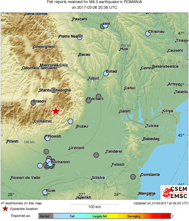 Nelle ultime ore sono state registrate in Europa orientale una serie di scosse di terremoto di magnitudo superiore a 3.0. La più forte ieri sera in Romania, nel distretto di Vrancea: una zona dove si verificano terremoti con una certa frequenza. Il sisma, con magnitudo Richter 4.0, ha avuto ipocentro profondo, a circa 90 km di profondità, come d’abitudine in questa area sismica. Avvertito dalla popolazione, non ha causato danni.