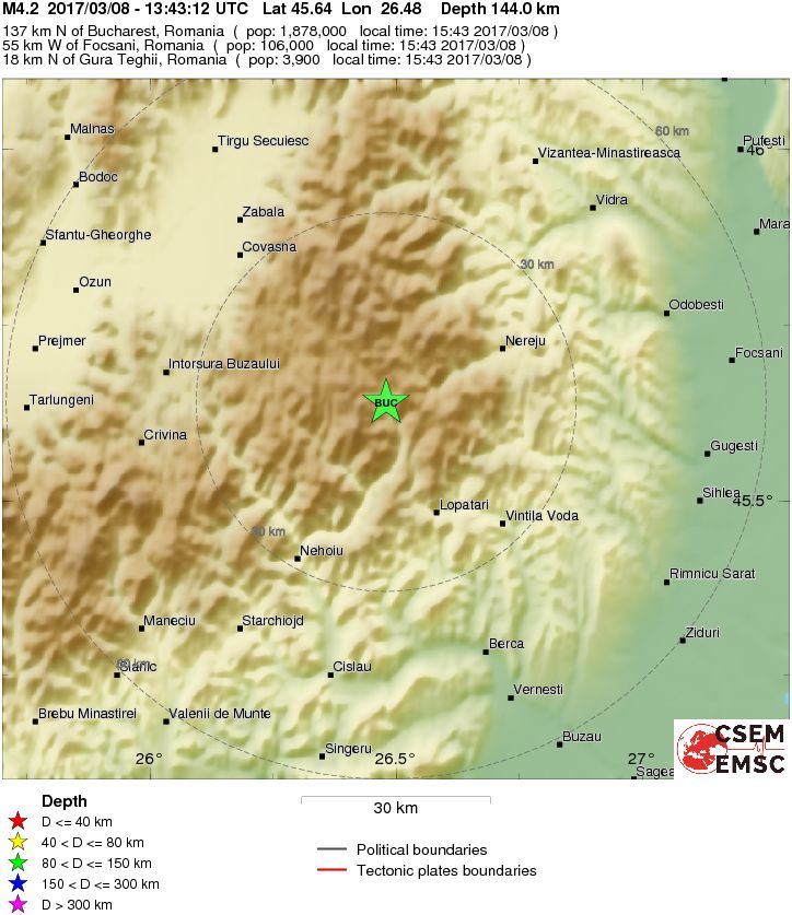 Ieri pomeriggio la scossa più forte, di magnitudo locale 4.2, era stata avvertita dalla popolazione un IV grado MCS di intensità. Il centro abitato più vicino all’epicentro, Gura Teghii. Non si registrano danni.