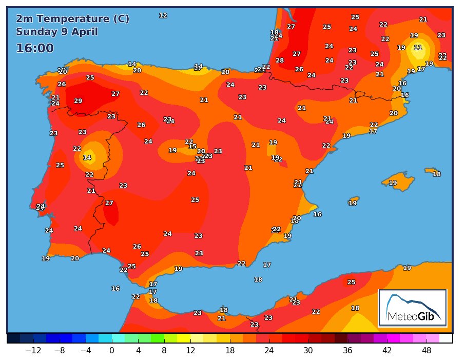 In Spagna e Portogallo è una Domenica delle Palme all’insegna del beltempo e del caldo. Le temperature massime fanno registrare valori praticamente estivi in alcune località, ben al di sopra della media mensile, e stavolta non solo nel Sud della Penisola iberica. Accanto ai 28°C di Cordova (Andalusia, Spagna) infatti, bisogna sottolineare i 28°C di Bilbao (nei Paesi Baschi spagnoli, nel nord) e, ancora più sorprendenti, i 30°C di Ourense e i 29°C di Pontevedra, in Galizia. Altra regione del nord della Spagna, abituata a clima ben più mite.