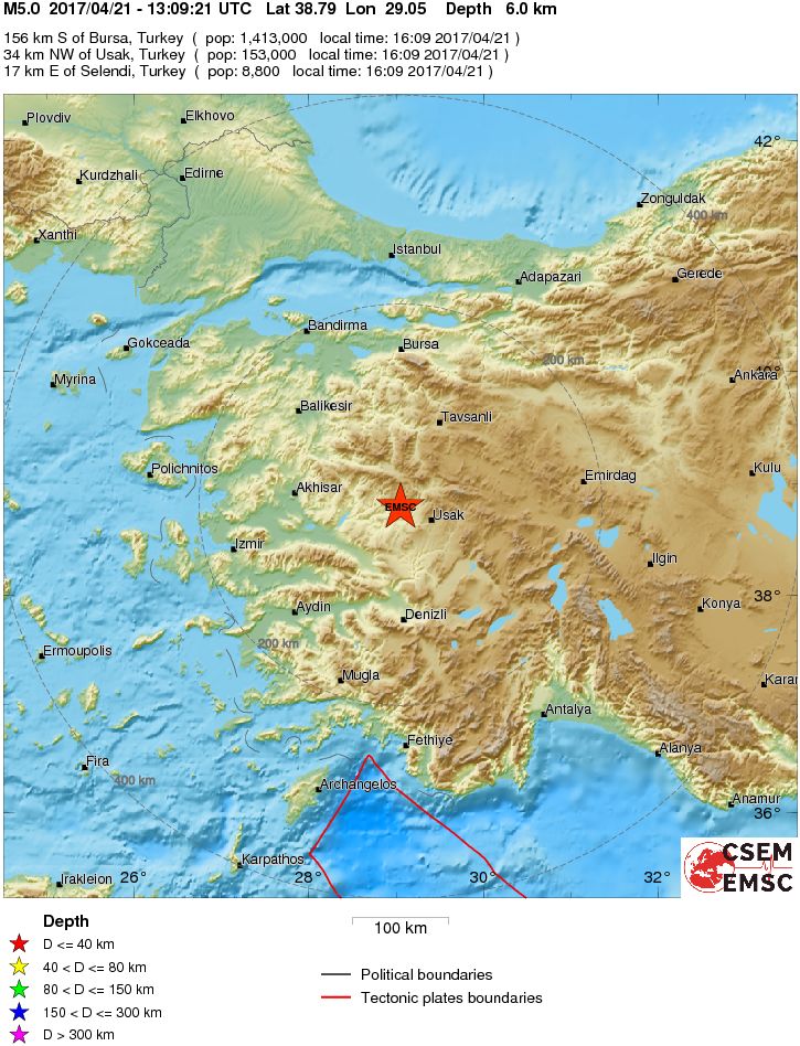 Due forti scosse di terremoto sono state registrate nel pomeriggio di oggi nella Turchia occidentale. La prima poco dopo le 15 ora italiana, ha avuto magnitudo mb 5.0 secondo EMSC, ed una intensità massima del IV grado MCS. L’epicentro a 34 km da U?ak, nella Turchia occidentale.