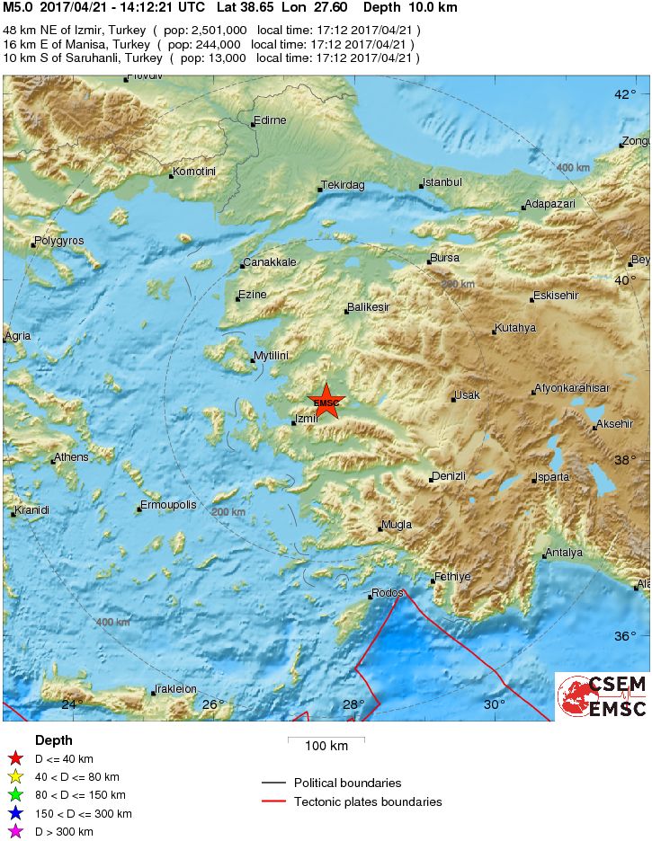 La seconda scossa, di magnitudo momento Mw 5.0, è stata registrata invece poco dopo le 16. Stavolta l’epicentro è stato ubicato a 10 km dalla località di Saruhanl?, più ad ovest rispetto alla prima forte scossa. Questo terremoto ha avuto un risentimento sismico importante, raggiungendo in alcune località il VI grado MCS. Ci potrebbero quindi essere stati leggeri danni. Al momento comunque non vengono riportati danni a persone né cose.