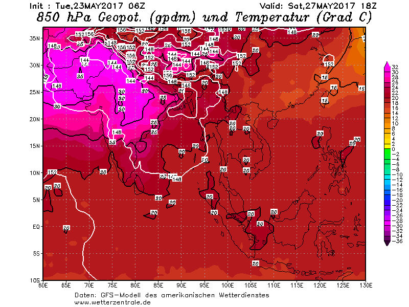 Il transito del ramo principale del “getto sub-tropicale” sopra il nord del Pakistan impedisce l’avanzata verso latitudini più settentrionali dell’anticiclone sub-tropicale che domina sull’area medio-orientale, l’Iran e il Pakistan meridionale, consentendo uno spostamento verso nord dell’umido flusso monsonico sud-occidentale che comincia a spingere verso le coste dell‘India meridionale e occidentale.