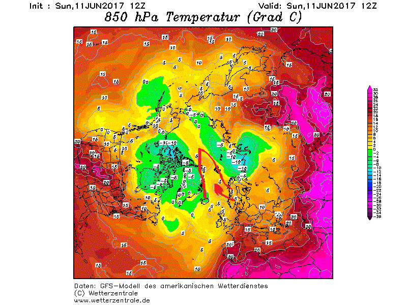 Vedere simili isoterme a 850 hpa nel cuore del mar Glaciale Artico è davvero molto raro, oltre che letale per i ghiacci del Polo Nord. Questa imponente avvezione di aria calda, che ha risalito il bordo occidentale del promontorio anticiclonico presente a ridosso del mar di Norvegia, con moderate correnti da SO e S-SO, persistendo per diversi giorni ha determinato una forte anomalia termica positiva che si ripercuoterà fra il mare di Groenlandia e le coste orientali di quest’ultima, con valori di oltre i +8°C +10°C superiori rispetto alle medie per il periodo. Tali anomalie si estenderanno fino alle Svalbard, le quali fungeranno un po’ da spartiacque con il resto del mar Glaciale Artico, che essendo coperto dal ghiaccio subirà ancora gli effetti dell’”Albedo”.