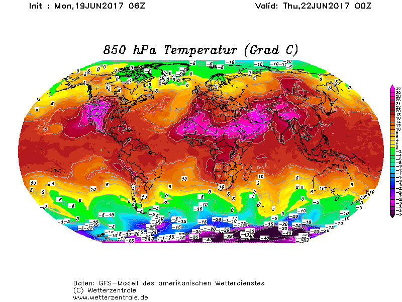 Parte di queste masse d’aria molto calde, caratterizzate da isoterme prossime ai +23°C +24°C a 850 hpa (circa 1400 metri), nel corso della settimana, fra giovedì e venerdì, riusciranno ad estendersi fino alla Repubblica di Jacuzia (considerato il polo del grande gelo invernale nell’emisfero boreale), determinando un considerevole aumento delle temperature anche qui. La vigorosa avvezione di aria calda, di origine temperata continentale, si spingerà fino al nord della Siberia centrale, risalendo il bordo più occidentale del robusto promontorio anticiclonico che evolverà rapidamente in un promontorio anticiclonico di blocco, esteso con un proprio asse principale (assetto meridianizzato) che dai deserti della Cina occidentale (in questo periodo “arroventati” dal prolungato soleggiamento diurno di giugno) si allungherà fino alla Jacuzia occidentale, “avvettando” in continuazione masse d’aria molto calde e secche fino al cuore della Siberia.