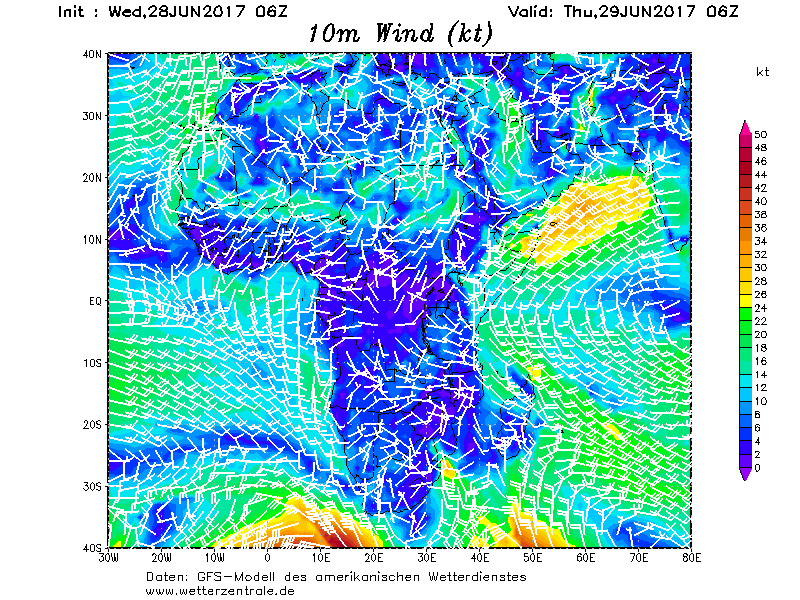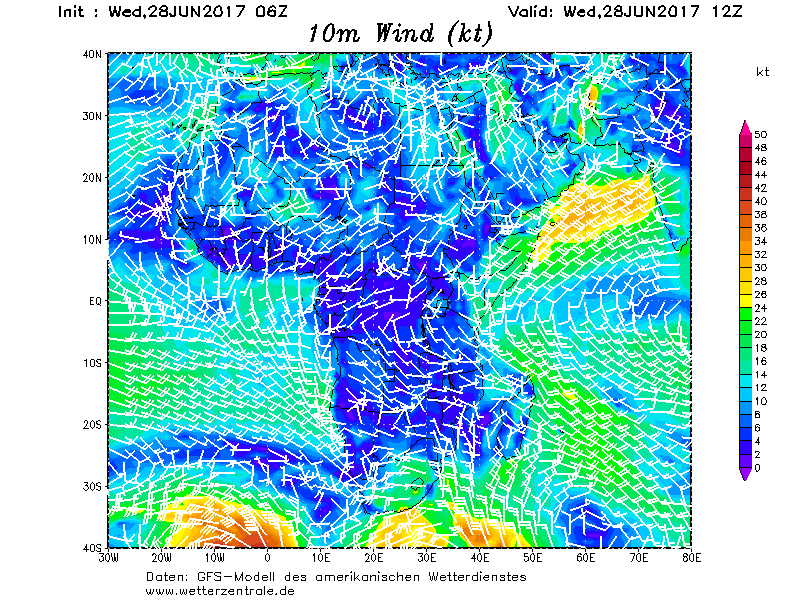 Con l’arrivo dell’ultima decade di giugno il flusso dell’umido “monsone di SO” andrà notevolmente a rafforzarsi fra le coste somale e quelle dell’India occidentale. Questo significativo rinforzo dei venti monsonici, che ora spirano a carattere burrascoso lungo buona parte del mar Arabico, è prodotto dall’inasprimento del “gradiente barico orizzontale” fra l’oceano Indiano sub-equatoriale e gli stati indiani settentrionali, dove è collocata la bassa pressione termica nei bassi strati (prodotta dall’intenso riscaldamento stagionale del sub-continente indiano, che occorre in coincidenza dei passaggi “zenitali” del sole), con valori barici sotto i 994 hpa. Questa profonda bassa pressione di natura termica, caratterizzata da un minimo barico al suolo attorno i 992-993 hpa sull’India settentrionale, sta incentivando un progressivo rinforzo degli intensi venti da SO e O-SO che in questi giorni sferzeranno le coste somale e il mar Arabico occidentale, con punte sopra i 60-70 km/h, e raffiche di picco anche oltre gli 90-100 km/h davanti le coste del Puntland e l’isola di Socotra.