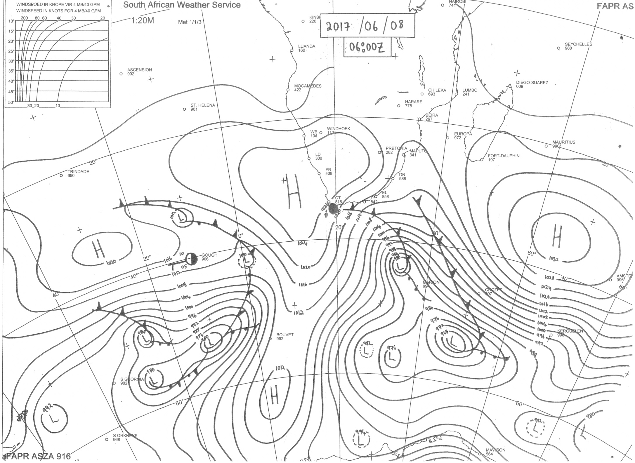 Il profondo ciclone extratropicale, a cui si associava il sopra citato fronte freddo, prima di avvicinarsi alle coste meridionali del Sudafrica si era ulteriormente approfondito, grazie alla costante alimentazione di aria fredda, di origini polare marittima, in risalita dall’Atlantico meridionale, lungo il suo bordo occidentale, dove era attiva una forte ventilazione da SO che ha raggiunto carattere di tempesta in pieno oceano (nel tratto antistante le coste sudafricane sud-occidentali). Approfondendosi, con un minimo barico al suolo sceso sotto i 975 hpa centrato a sud-ovest del Capo di Buona Speranza, il ciclone extratropicale ha presentato pure un intenso “gradiente barico orizzontale” (isobare molto strette fra loro) che dall’Atlantico meridionale si è successivamente esteso al Sudafrica occidentale, spingendo su questo intensi venti da O-NO, fino allo stato di burrasca nel tratto di costa compreso fra Capo di Buona Speranza e l’area della baia di Sant’Elena, con picchi di oltre gli 80-90 km/h, localmente anche più nei punti maggiormente esposti alla ventilazione proveniente dal quadrante occidentale.
